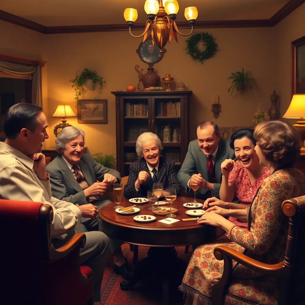 Bring to life a vintage family gathering from the 1920s. Depict a joyful scene of relatives laughing, playing games, and enjoying each other's company in a cozy living room filled with warm lighting, antique furniture, and nostalgic decorations. Incorporate realistic textures, colors, and subtle animations to create a captivating image.