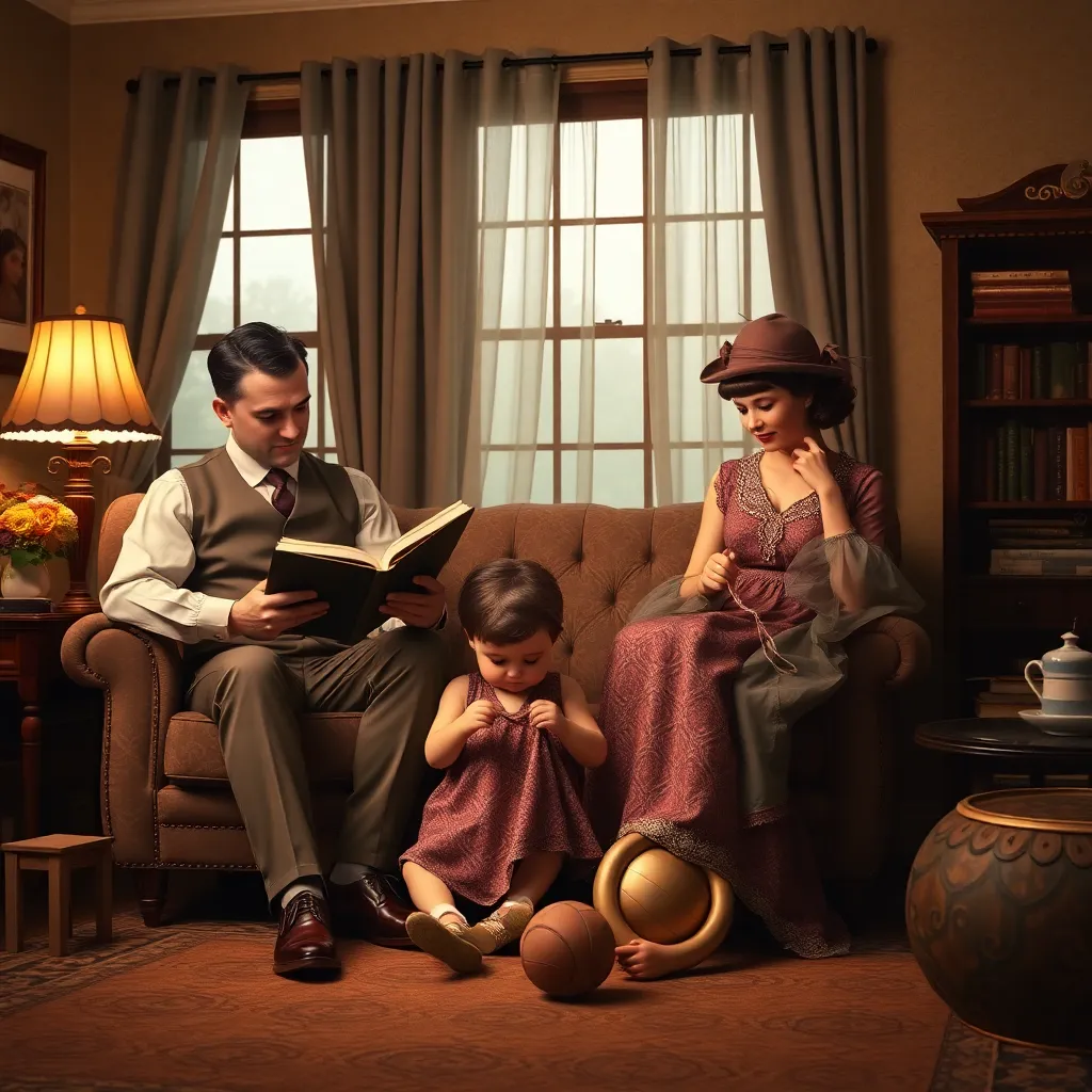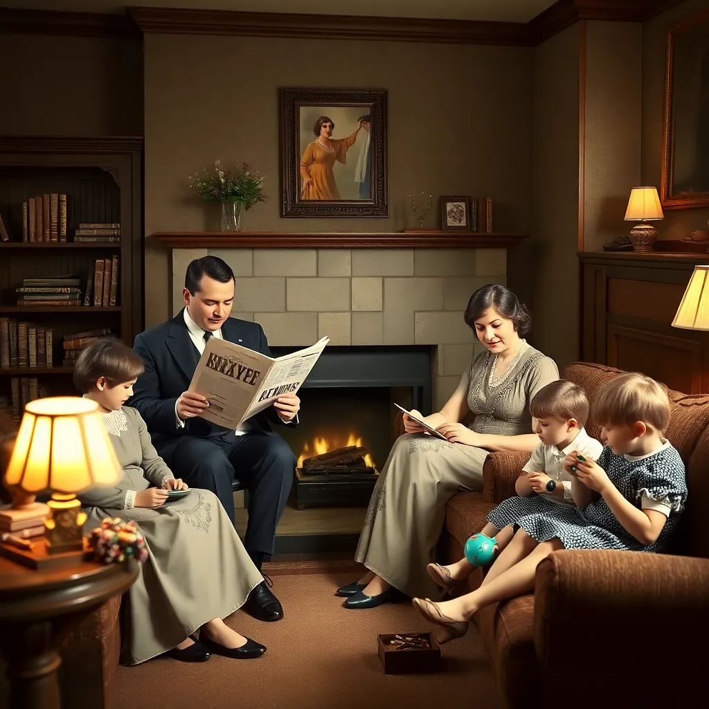 Bring to life a vintage family portrait from the 1920s. The scene should take place in a cozy living room with warm lighting, soft furnishings, and a crackling fireplace. The family should be dressed in their finest attire, with the father reading a newspaper, the mother sewing, and the children playing with toys.