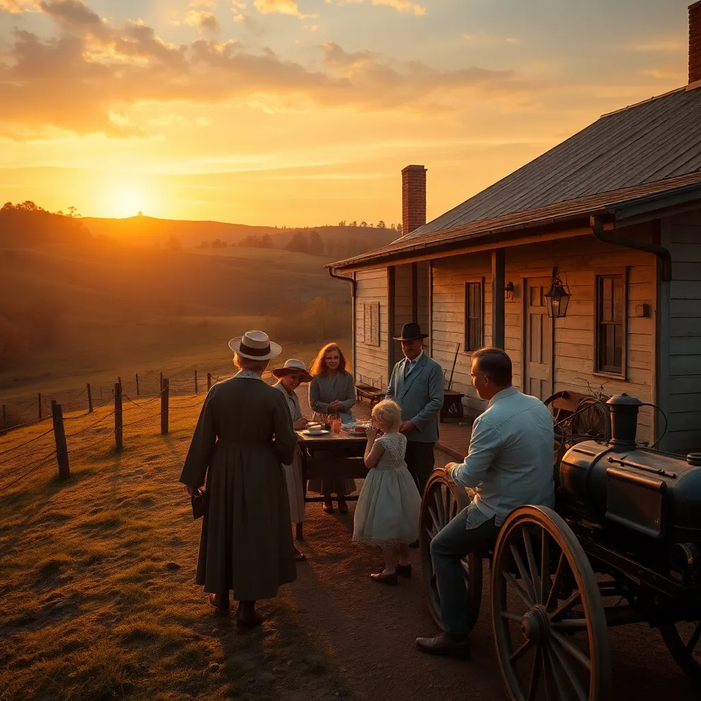 Bring to life a nostalgic scene from the early 20th century. Imagine a family gathering at a quaint farmhouse, surrounded by rolling hills and a warm sunset glow. Incorporate period-specific details, such as vintage clothing and antique farm equipment, to create a captivating and immersive AI-generated image.