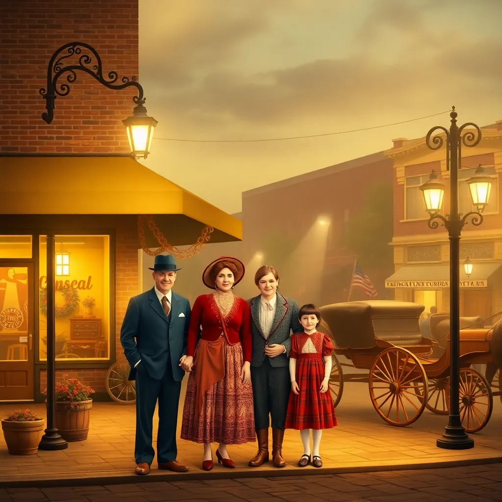 Bring to life a vintage family portrait from the 1920s. The scene should be set in a quaint small-town main street, with the family standing outside their general store, surrounded by old-fashioned street lamps, horse-drawn carriages, and a charming town square. Incorporate warm, golden lighting and subtle animations.