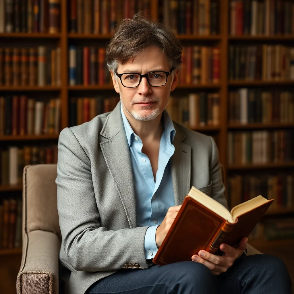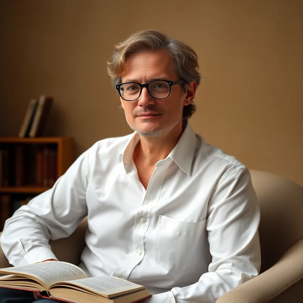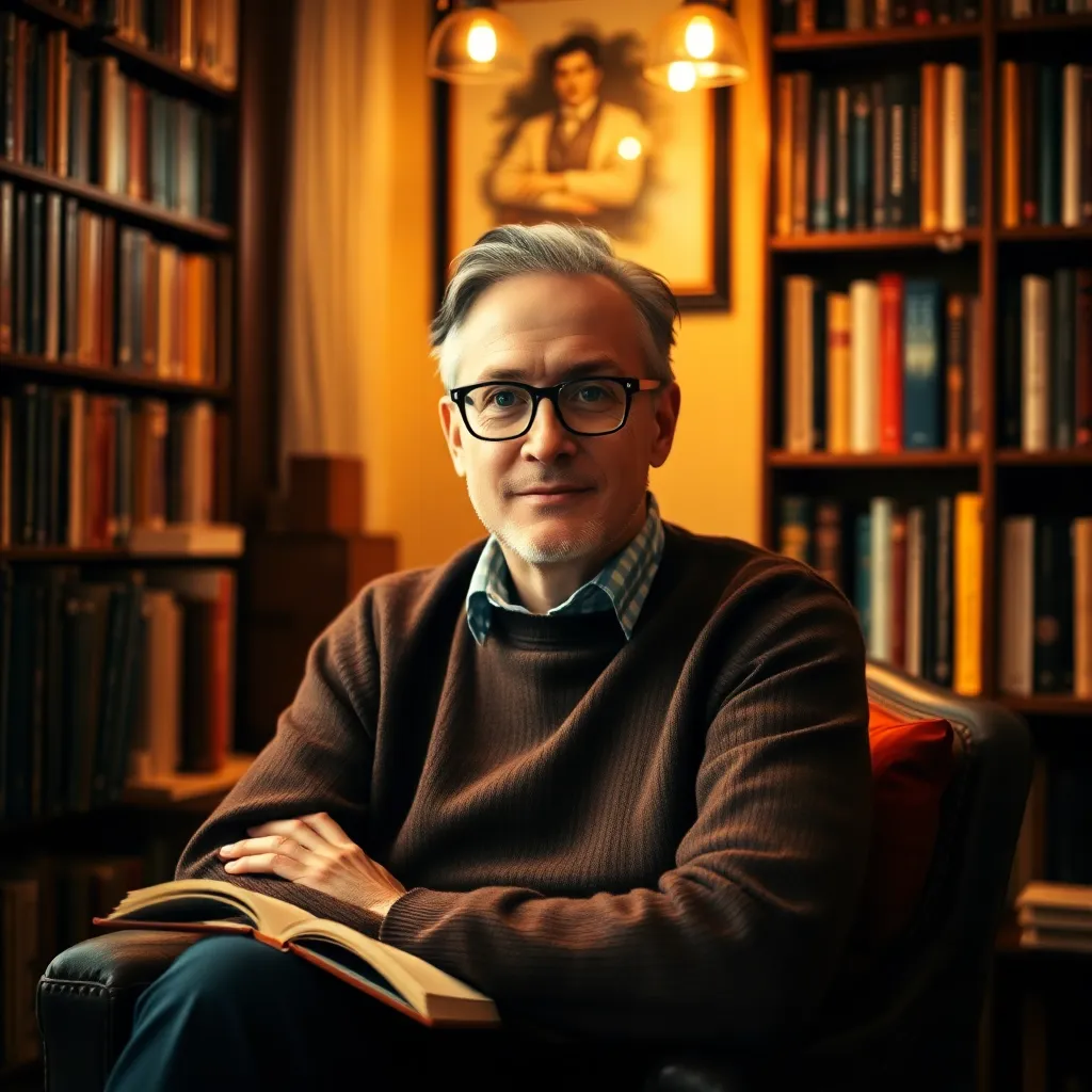 Capture the essence of a renowned author's persona in a high-quality headshot. Imagine a warm, well-lit studio setting with a classic, timeless aesthetic. The author, dressed in comfortable yet stylish attire, sits confidently with a hint of a smile, surrounded by books, papers, or a subtle literary prop.