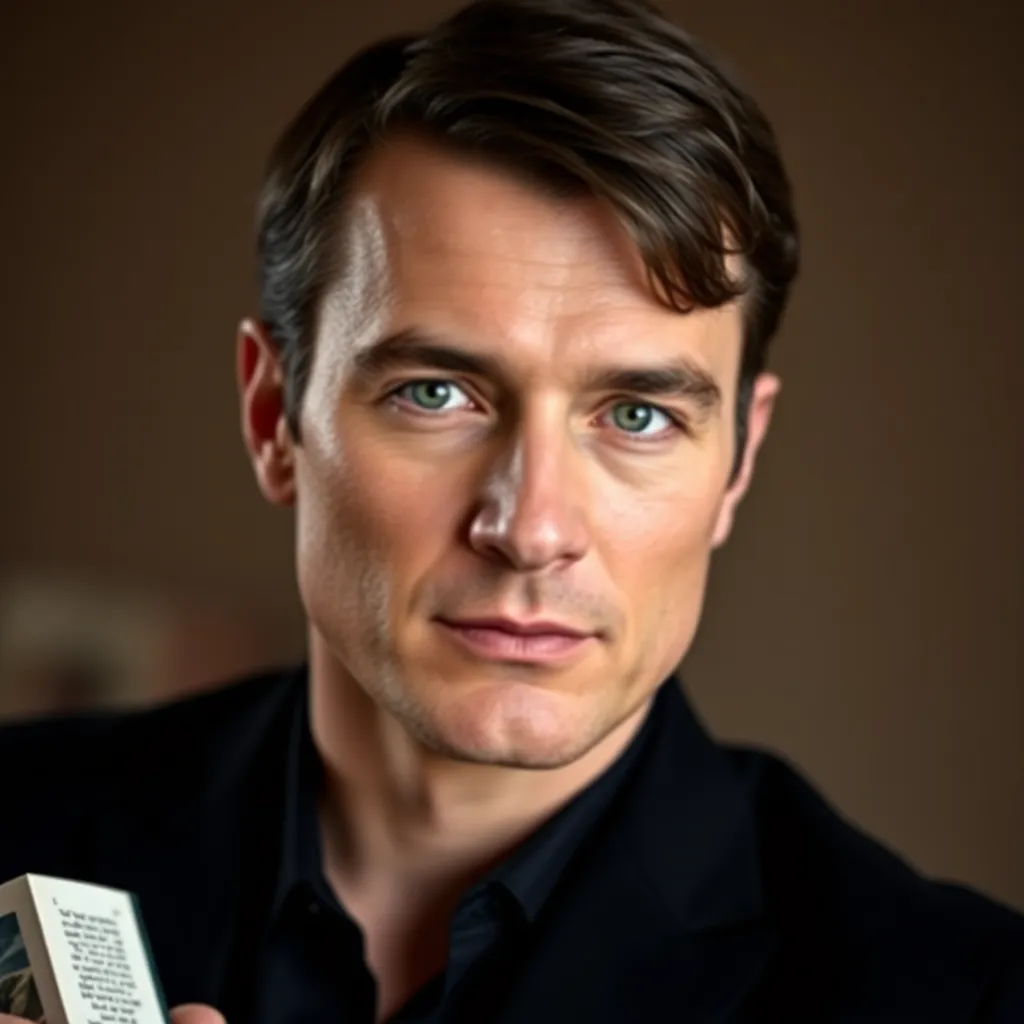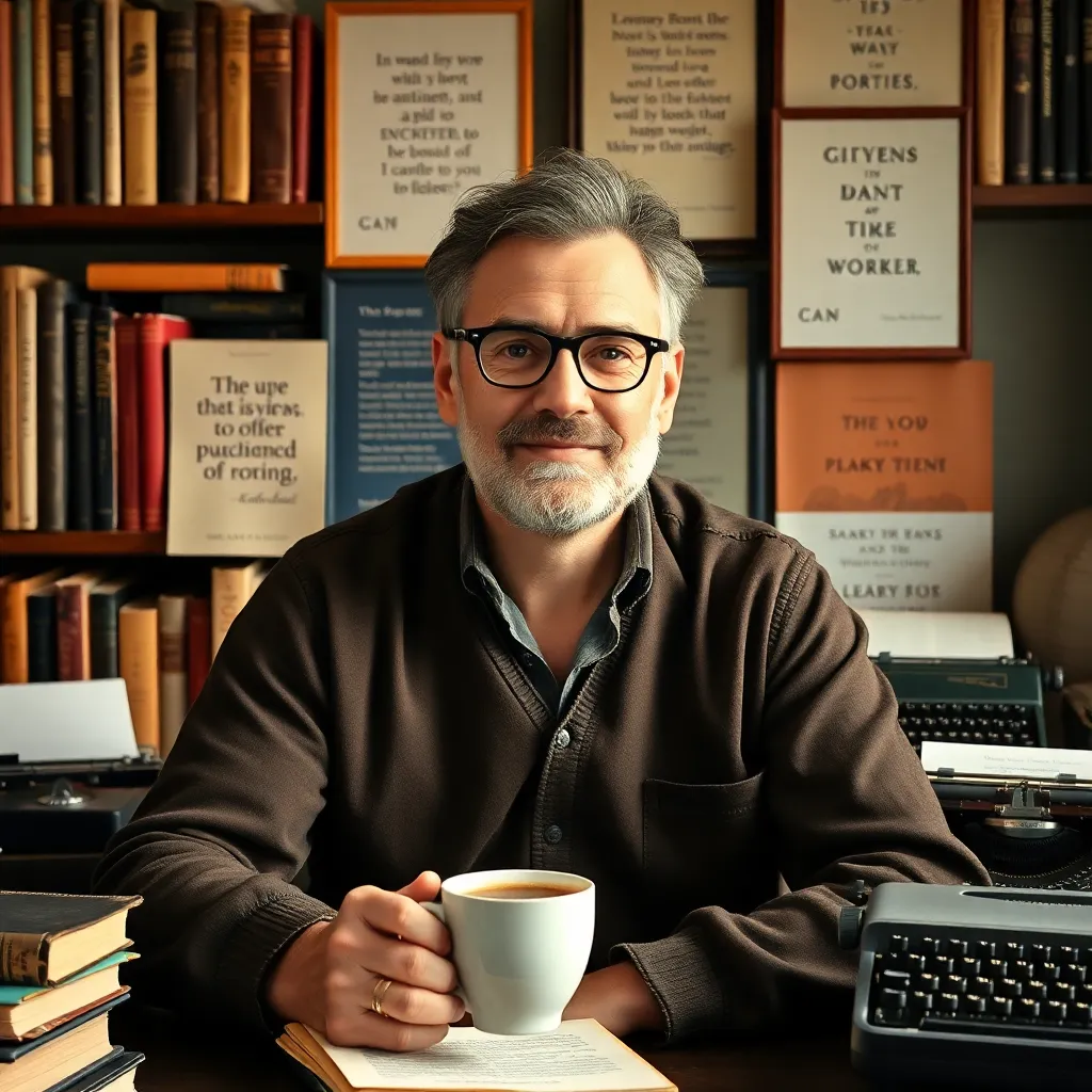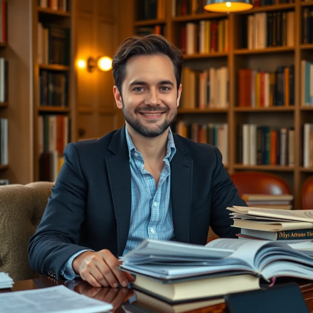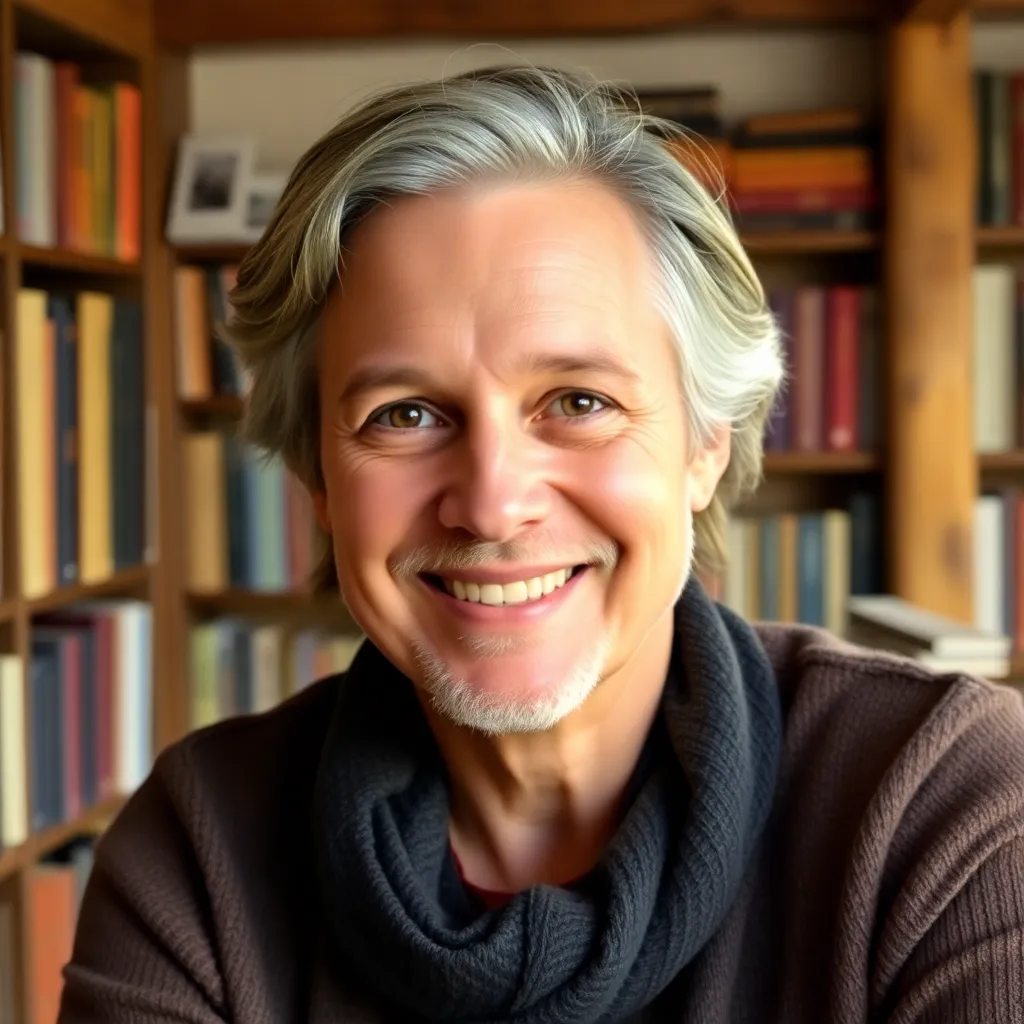 Capture the essence of a renowned author's persona in a high-quality headshot. Imagine a warm, well-lit studio setting with a classic, timeless aesthetic. The author, dressed in comfortable yet stylish attire, sits confidently with a hint of a smile, surrounded by books, papers, or a subtle literary prop.