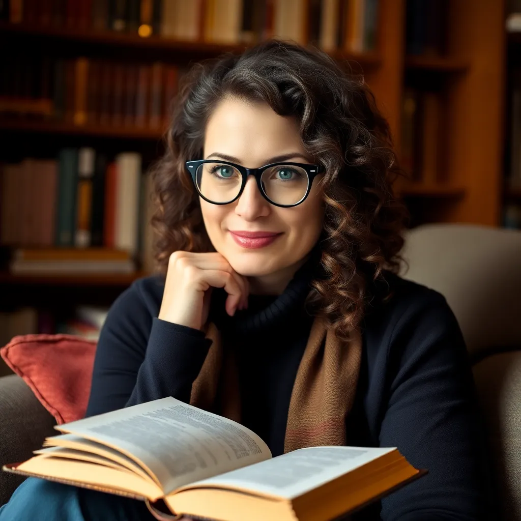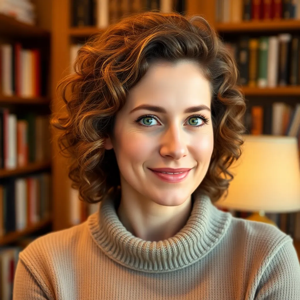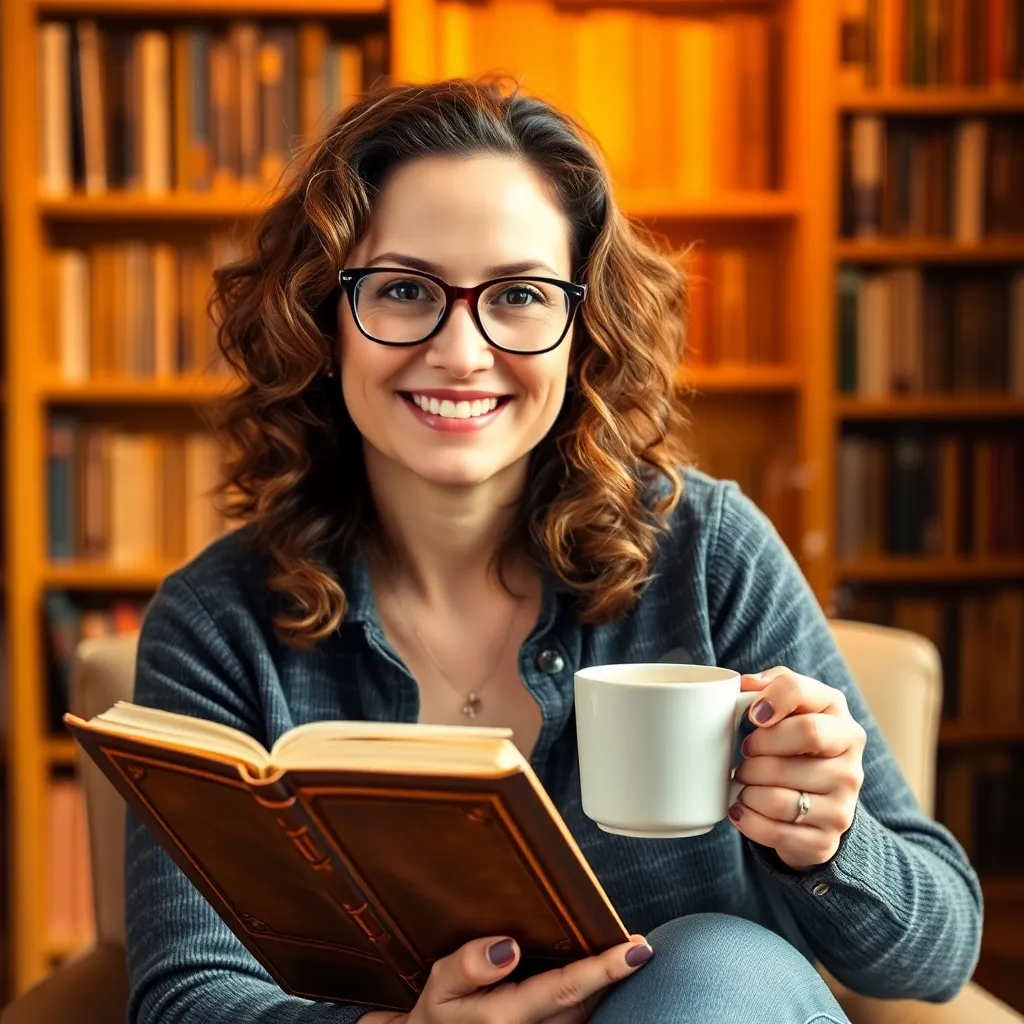 Create a captivating author headshot for a best-selling novelist. Imagine a warm, golden-lit studio setting with a cozy bookshelf background. The author, a bespectacled woman with curly brown hair and a warm smile, sits with a worn leather-bound book and a cup of steaming coffee. Capture her creative essence.