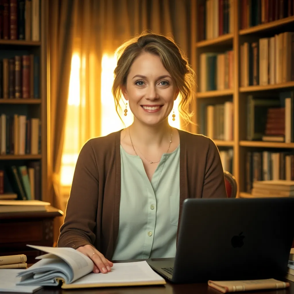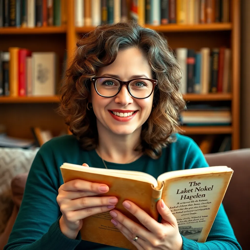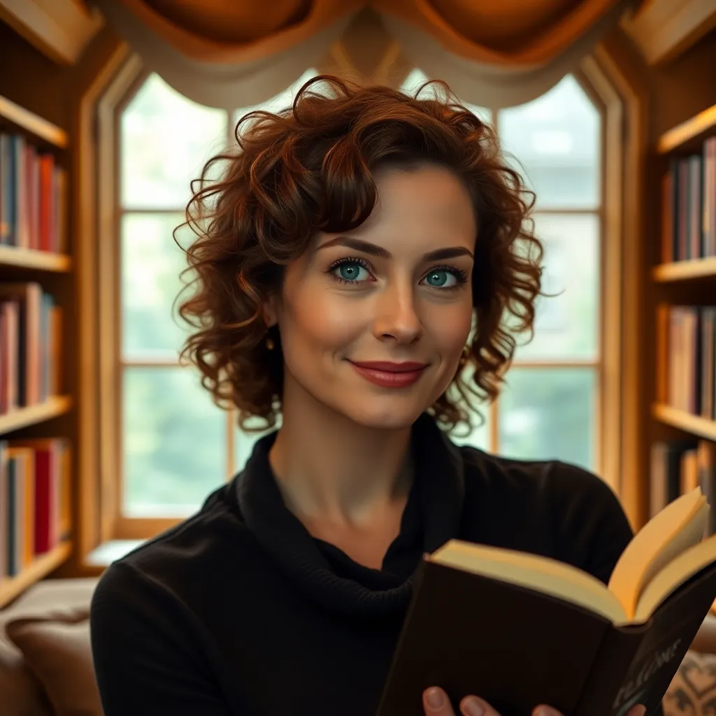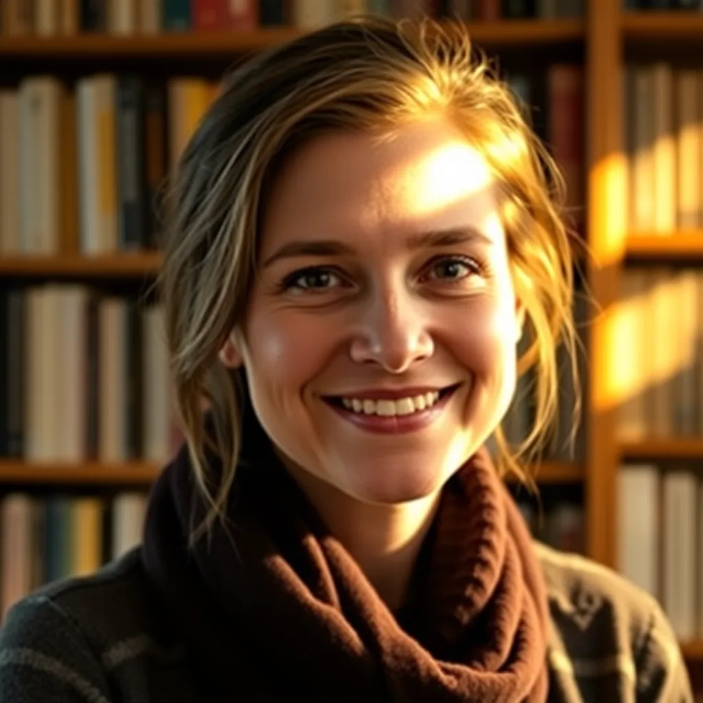 Create a captivating author headshot for a best-selling novelist. Imagine a warm, golden-lit studio setting with a cozy bookshelf background. The author, a bespectacled woman with curly brown hair and a warm smile, sits with a worn leather-bound book and a cup of steaming coffee. Capture her creative essence.
