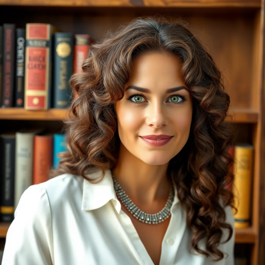 Create a captivating author headshot for a bestselling thriller writer. The subject is a 35-year-old woman with curly brown hair and bright green eyes. She's wearing a classic white blouse and a statement silver necklace. The background is a warm, rustic bookshelf with a few favorite novels displayed.