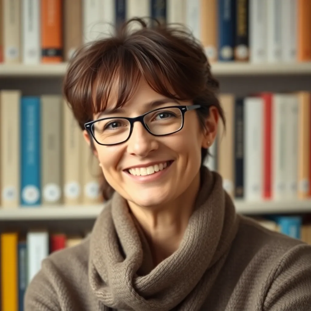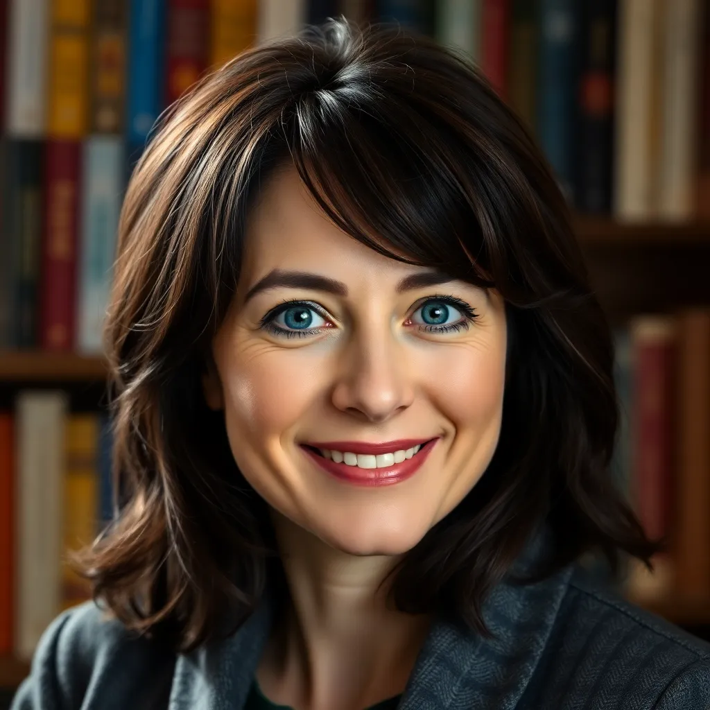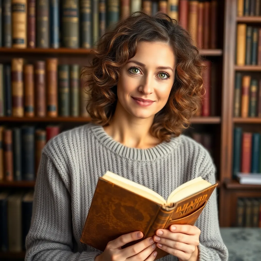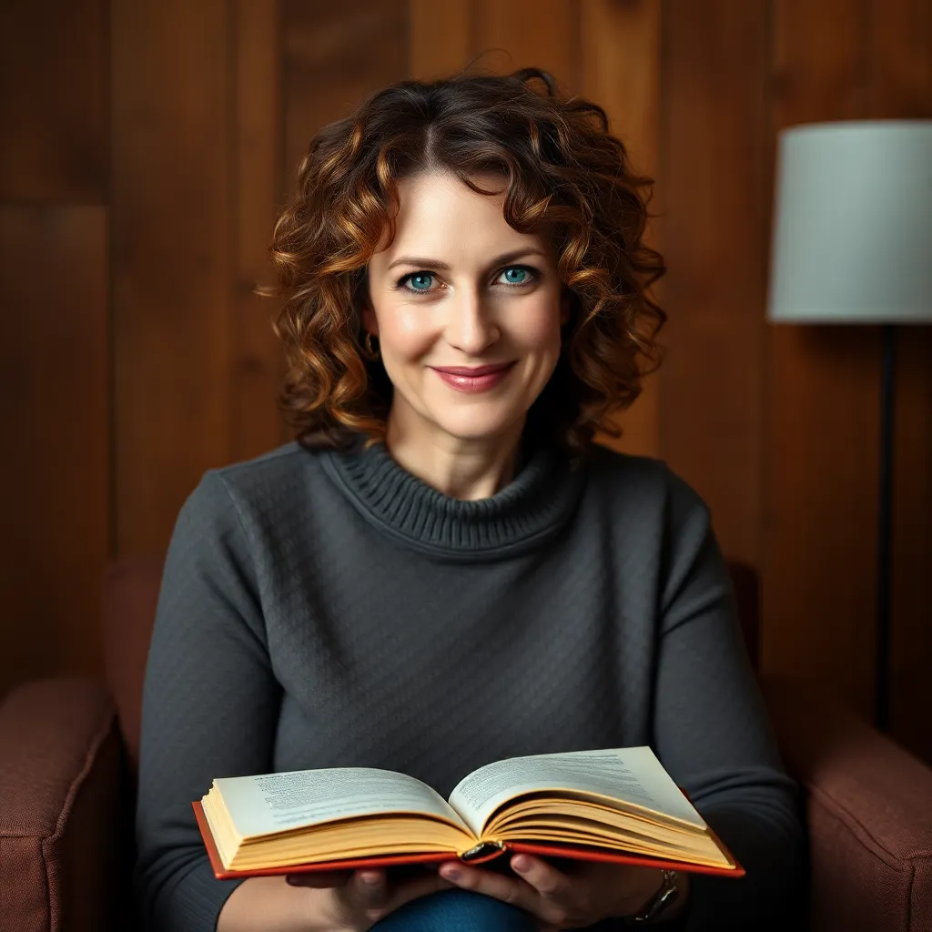 Create an author headshot with a professional yet approachable vibe. Imagine a warm, well-lit studio setting with a cozy bookshelf in the background. The author, a middle-aged woman with curly brown hair and bright green eyes, sits comfortably with a smile, cradling a worn leather-bound book in her hands.