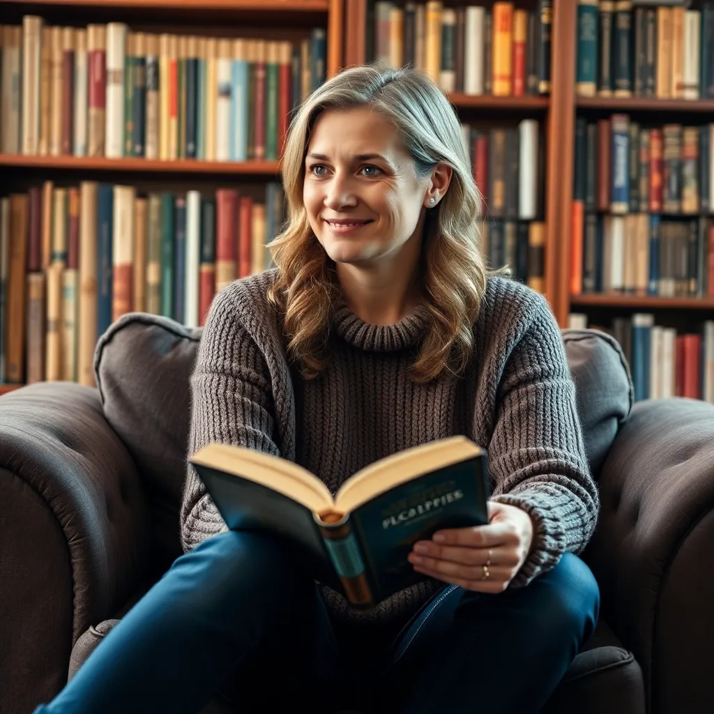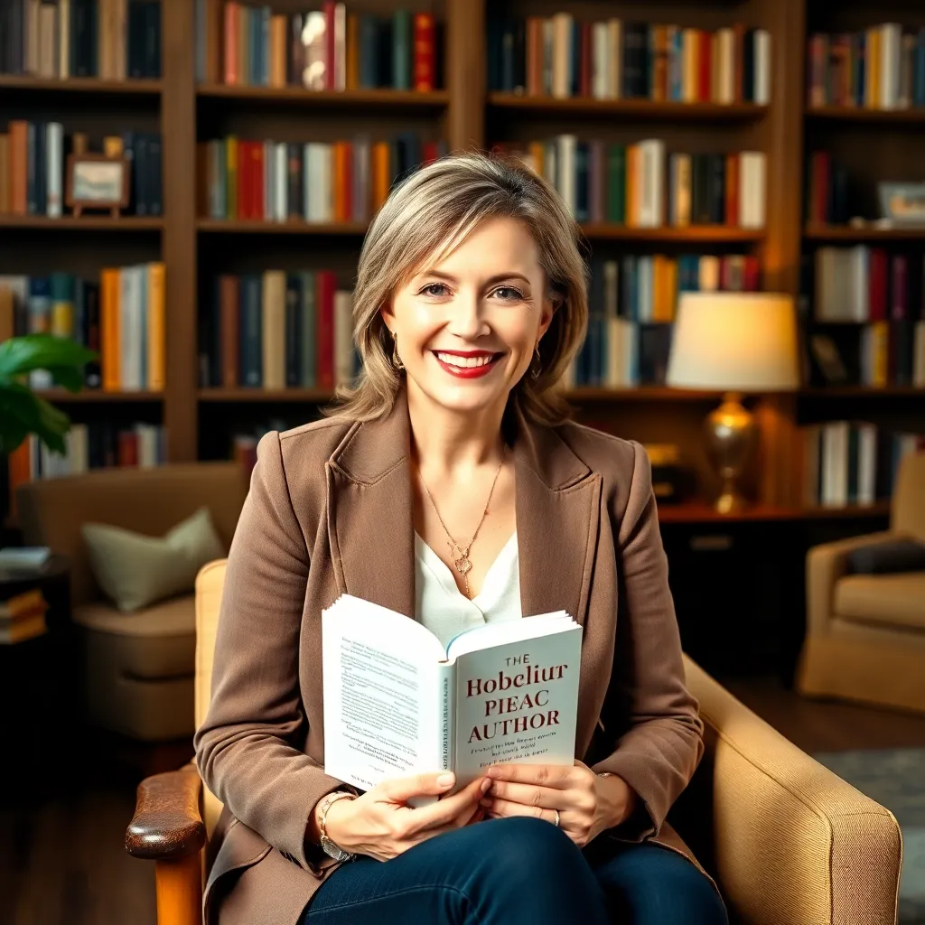 Create a captivating author headshot that captures the essence of a bestselling novelist. Imagine a warm, well-lit studio setting with a classic bookshelf background. The author, dressed in a stylish outfit, sits comfortably with a thoughtful expression, holding a worn leather-bound book or a pen and notebook.