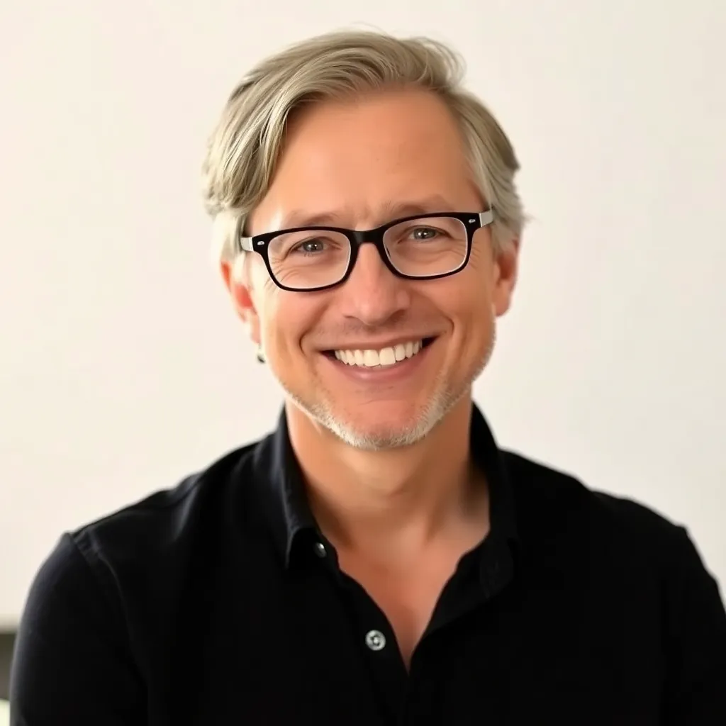 Create a captivating author headshot. Imagine a warm and inviting atmosphere, with soft natural light illuminating the subject's face. The author, a bespectacled individual with a kind smile, sits comfortably with a book or laptop nearby. Capture the essence of creativity and intellectual curiosity in this serene setting.