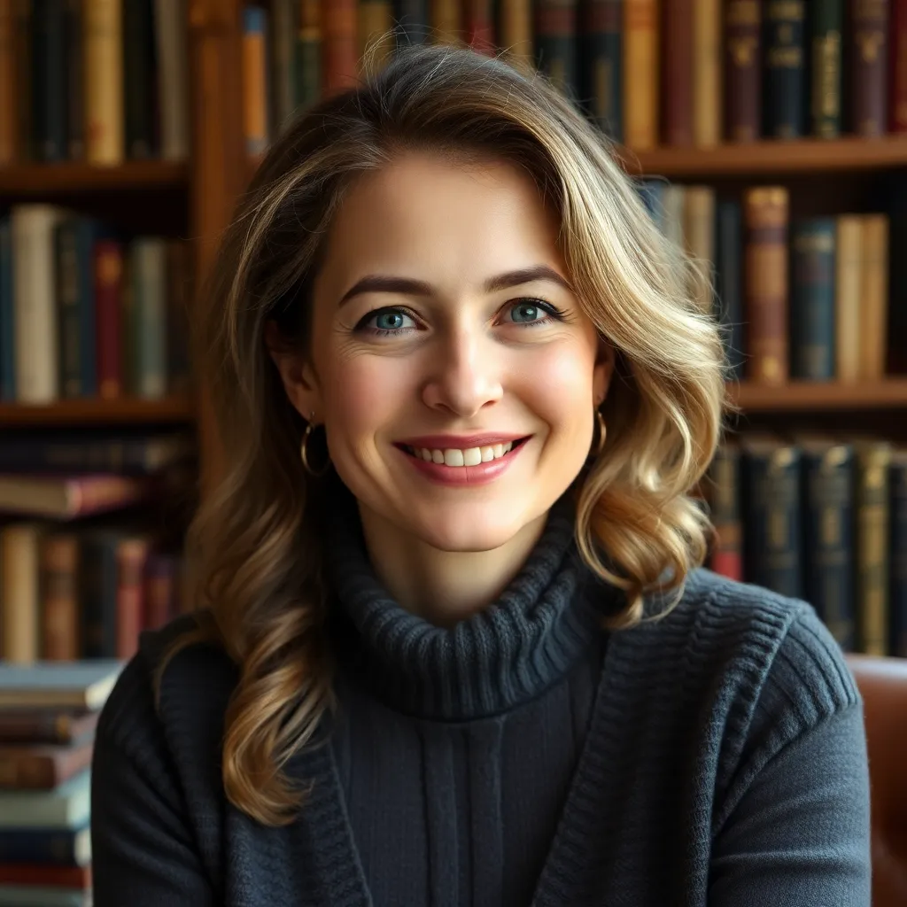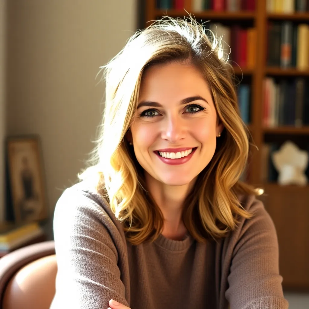 Create a professional author headshot with a warm and inviting smile. The subject, a published writer, sits in a cozy book-filled room with a subtle background blur. Soft, natural light illuminates their face, highlighting their eyes and highlighting their love for reading and storytelling. Hair is styled casually, with a hint of elegance.