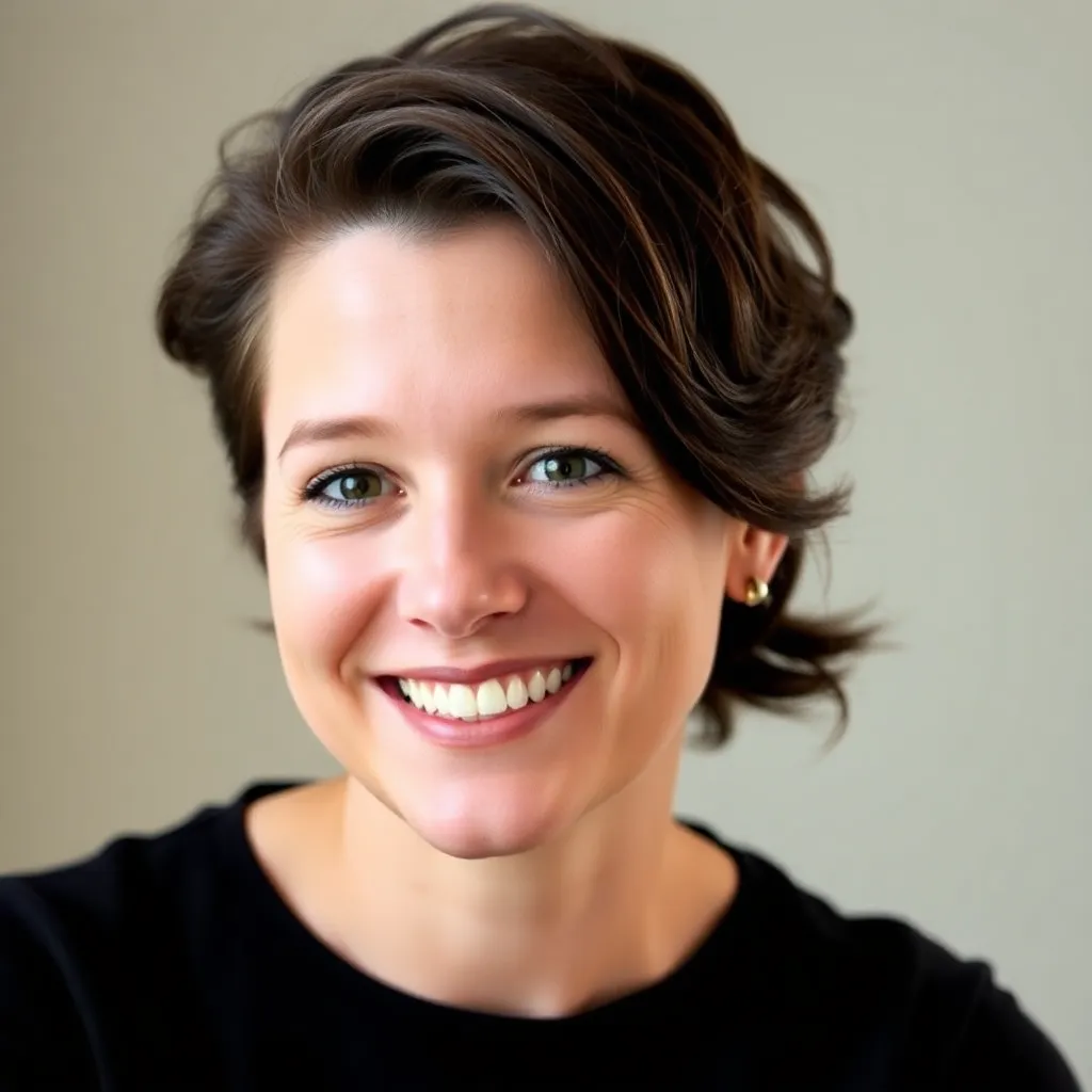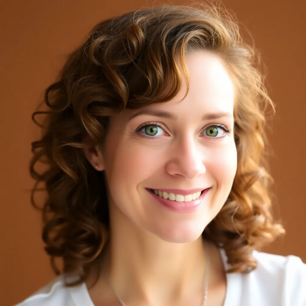 Create a professional headshot of a published author, approximately 35-50 years old, with a warm and approachable expression. The author has curly brown hair, bright green eyes, and a gentle smile. They're wearing a crisp white shirt and a simple silver necklace. The background is a warm, neutral color.