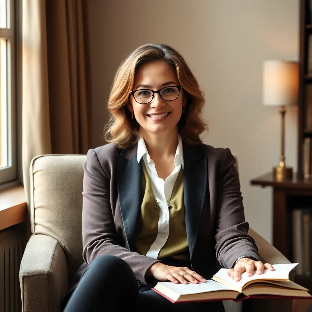 Create a professional author headshot. Imagine a warm and inviting atmosphere with soft, natural light. The author, dressed in a stylish outfit, sits comfortably with a book or writing instrument nearby. A subtle background with a touch of color adds depth. Capture a sense of approachability and intellectual curiosity.