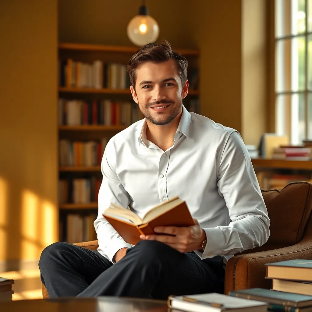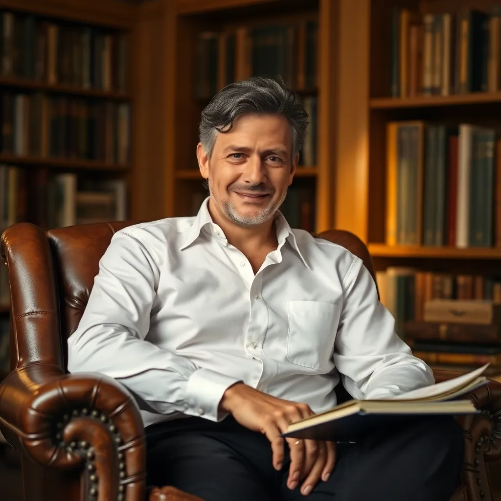 Create a stunning author headshot for a bestselling thriller writer. Imagine a warm, natural light illuminating a cozy study or library. The author, dressed in a crisp white shirt and dark trousers, sits comfortably in a leather armchair, surrounded by books and papers. A hint of a smile hints at the intrigue within.