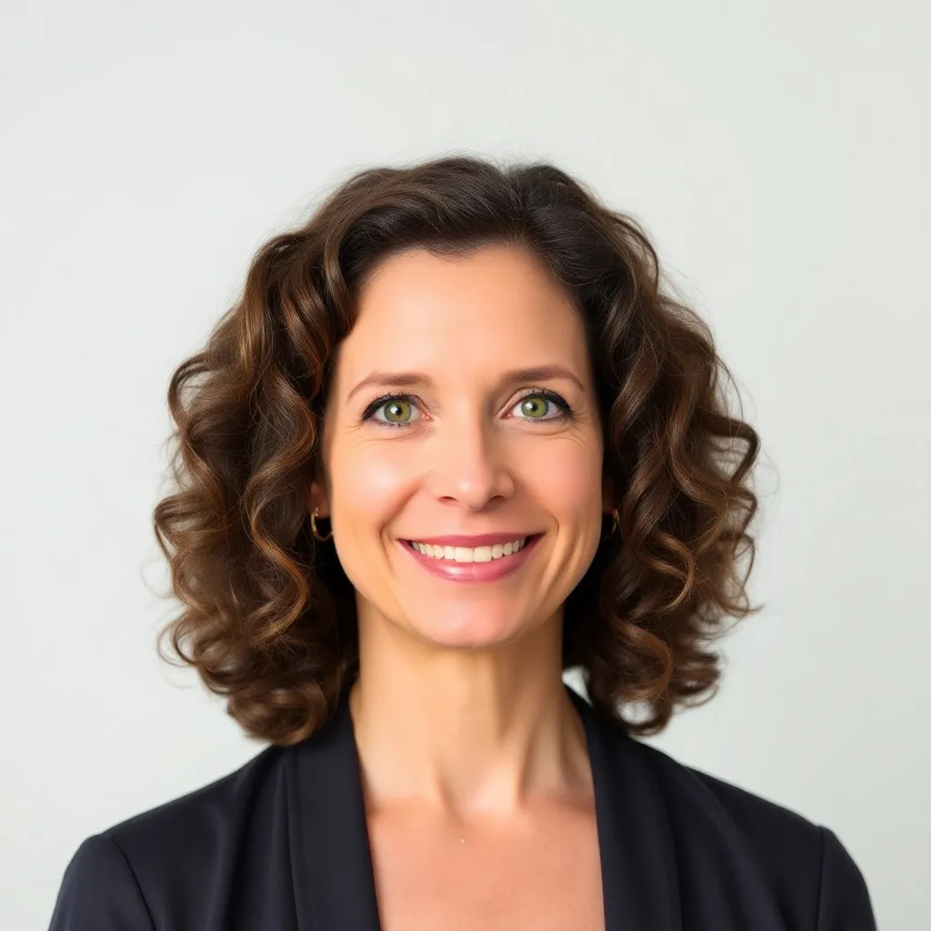 Create a professional headshot of an author, showcasing a warm and approachable expression. The author is a middle-aged woman with curly brown hair, bright green eyes, and a gentle smile. She's wearing a simple yet elegant outfit, possibly with a book or writing-related accessory, against a soft, neutral background.