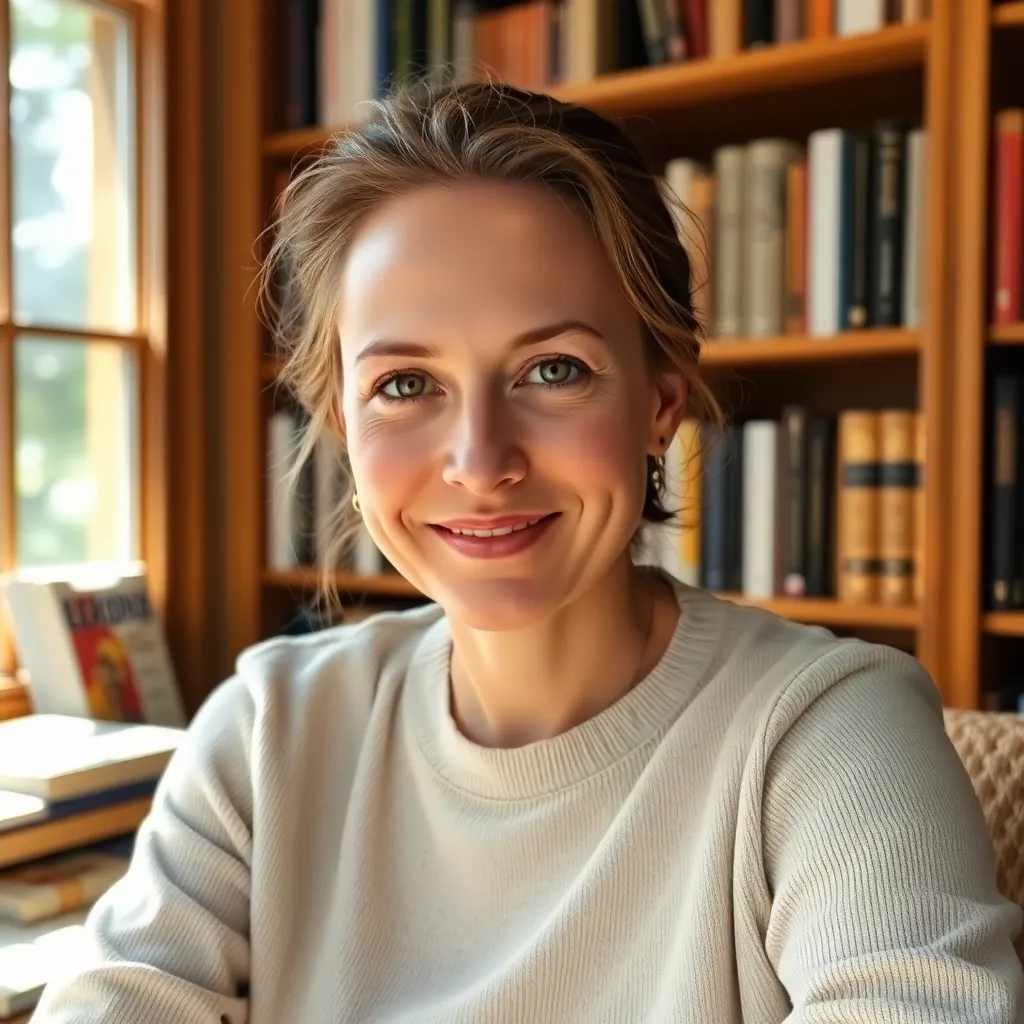 Create a captivating author headshot. Imagine a professional writer, sitting in a cozy book-filled study, surrounded by soft natural light. The author's face is relaxed, with a hint of a smile, and their eyes sparkle with creativity. Capture a sense of warmth, intelligence, and literary charm in this AI-generated image.