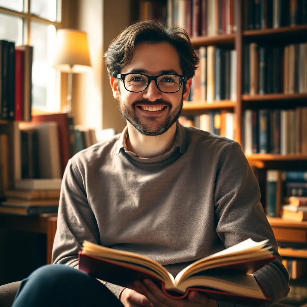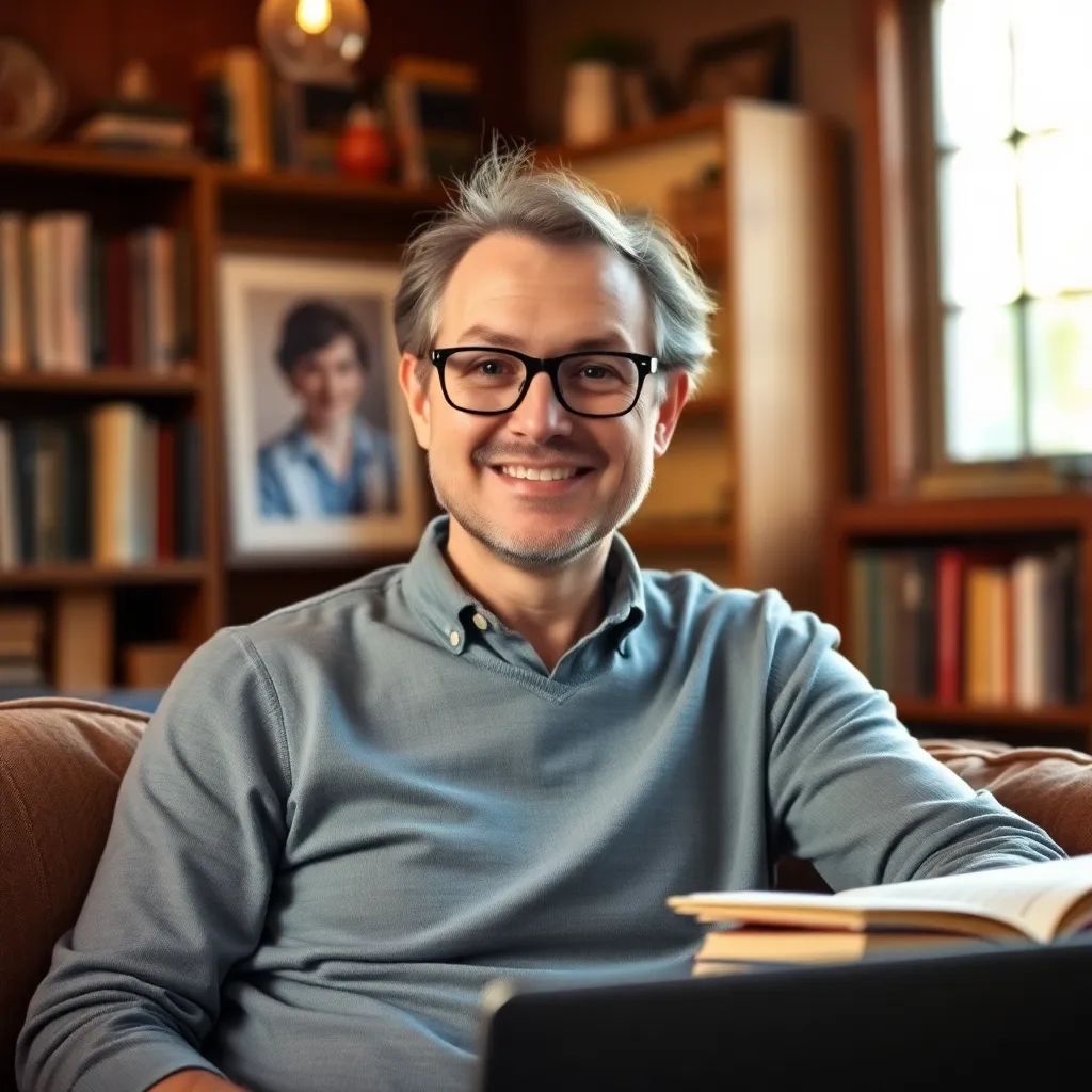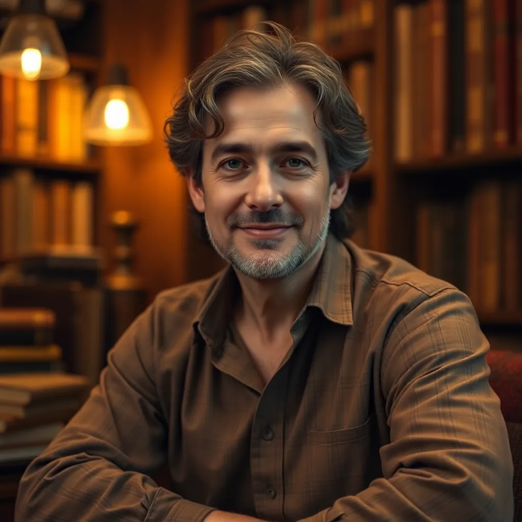 Create a captivating author headshot. Imagine a warm, well-lit studio setting with a bookshelf or literary props in the background. The author, a bespectacled individual with a kind face, sits comfortably with a thoughtful expression, surrounded by a subtle glow. Capture the essence of a writer's creative spirit.
