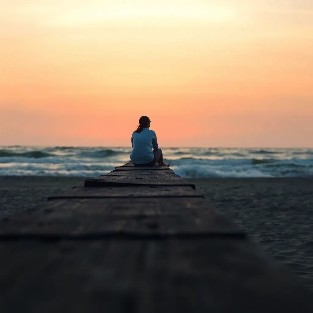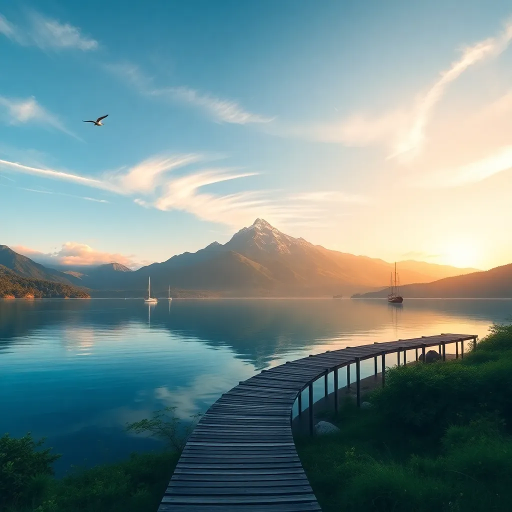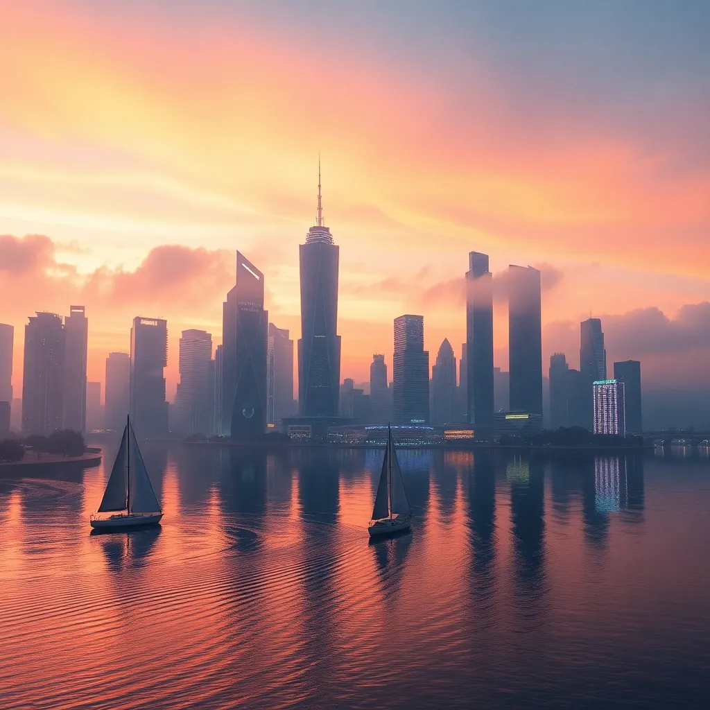 Create a futuristic cityscape at sunset, with towering skyscrapers and neon lights reflecting off a serene lake. Incorporate a futuristic monorail system and a subtle glow of holographic advertisements. The sky should be a warm orange-pink hue, with a few wispy clouds drifting lazily across the horizon.