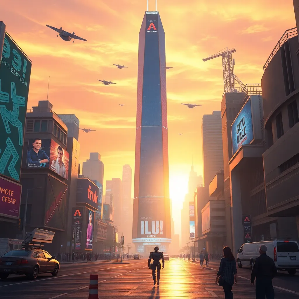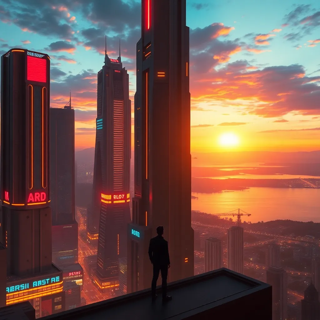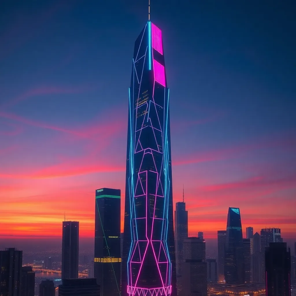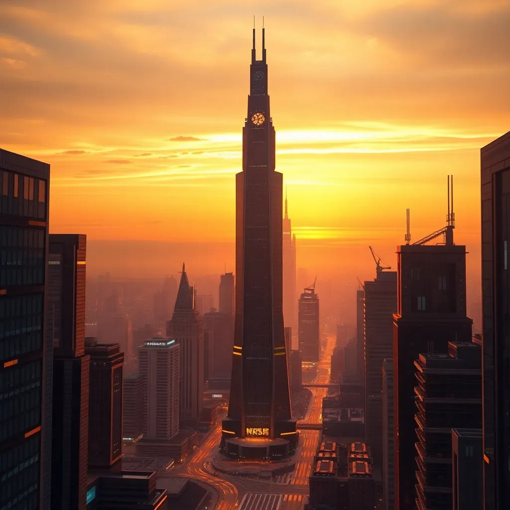 Create an image of a futuristic cityscape at sunset, with a towering skyscraper in the center, surrounded by sleek high-tech buildings and neon-lit streets. The sky should be a warm orange-yellow hue, with a few wispy clouds drifting across the horizon. Incorporate subtle city lights and ambient glow.
