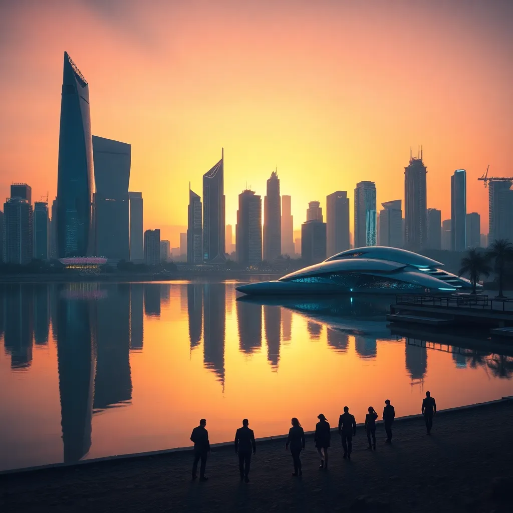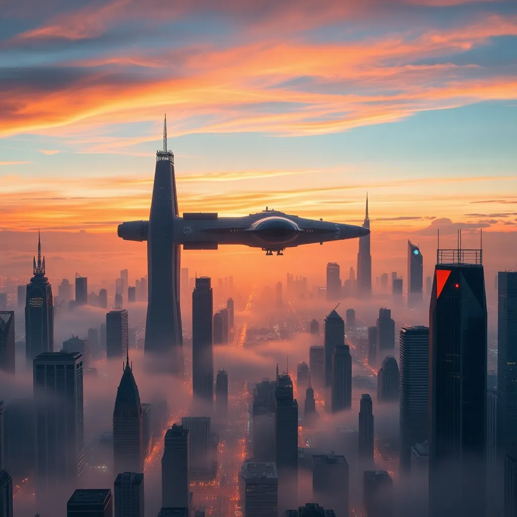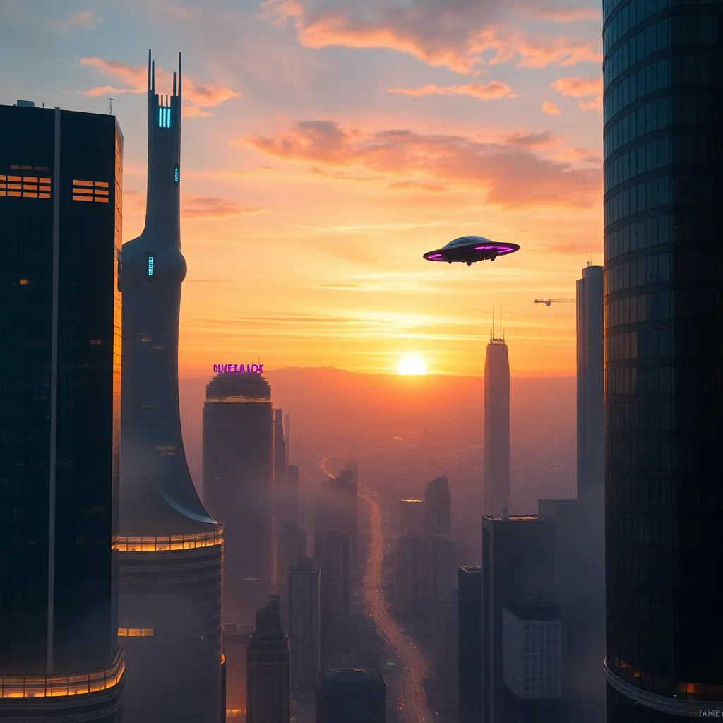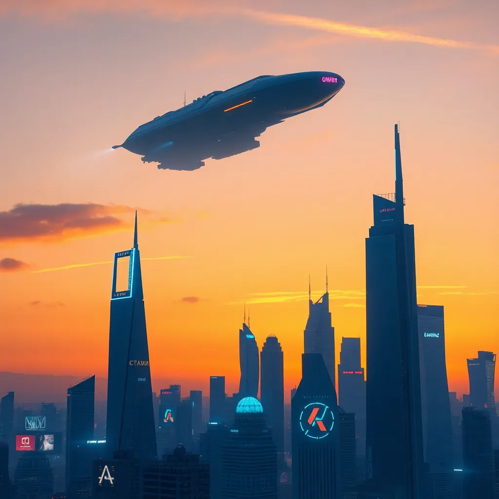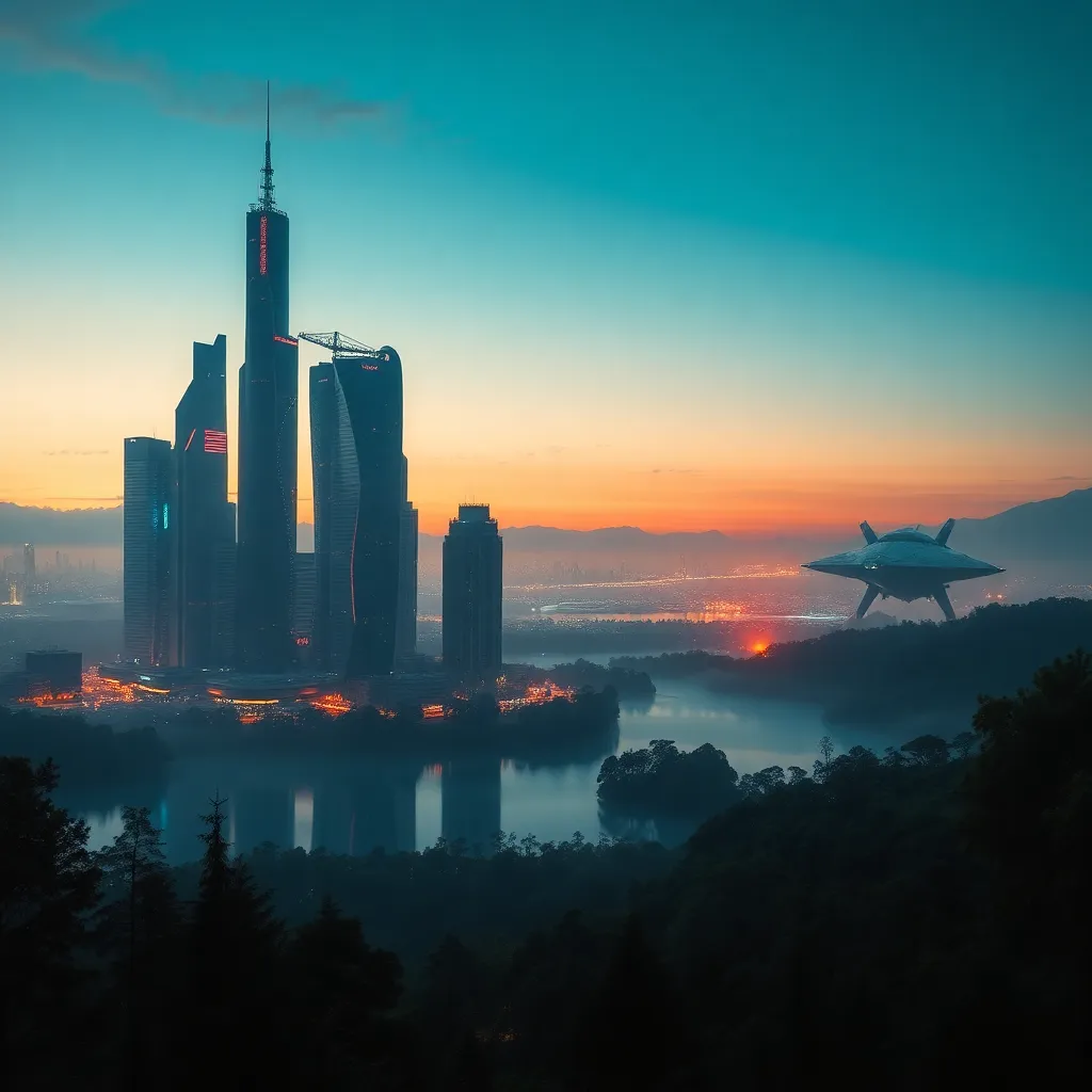 Imagine a futuristic cityscape at dusk, with sleek skyscrapers and neon lights reflecting off a misty lake. The city is surrounded by a lush forest, with a faint glow emanating from the trees. In the distance, a massive spaceship is docked, emitting a soft hum. Generate an image that captures this scene.