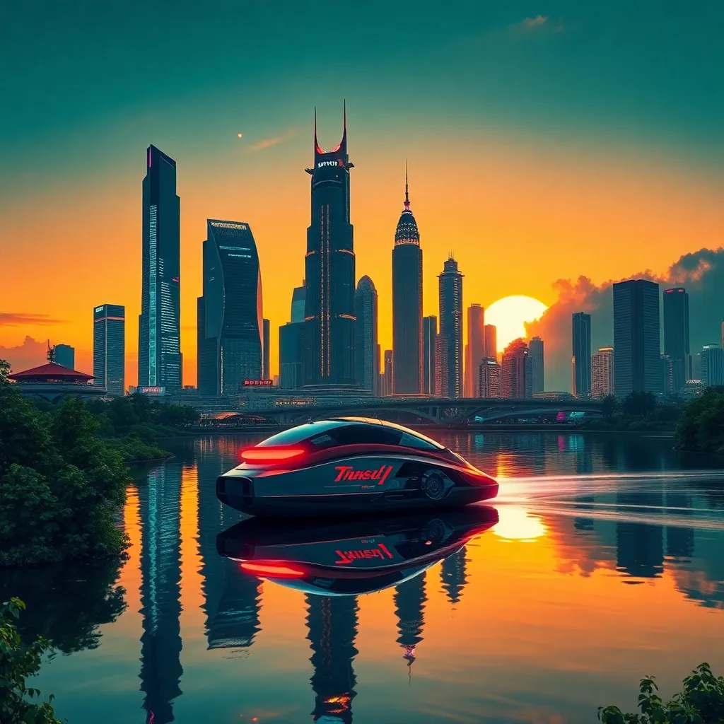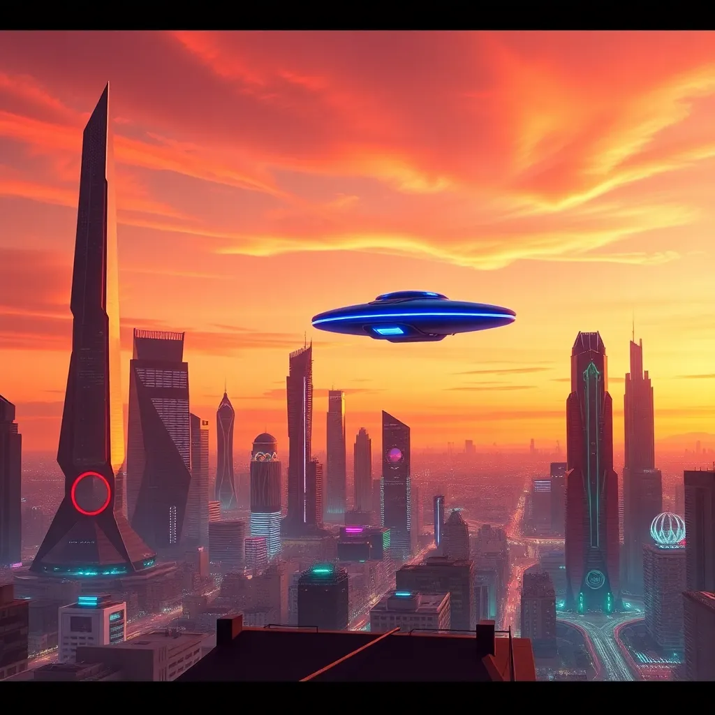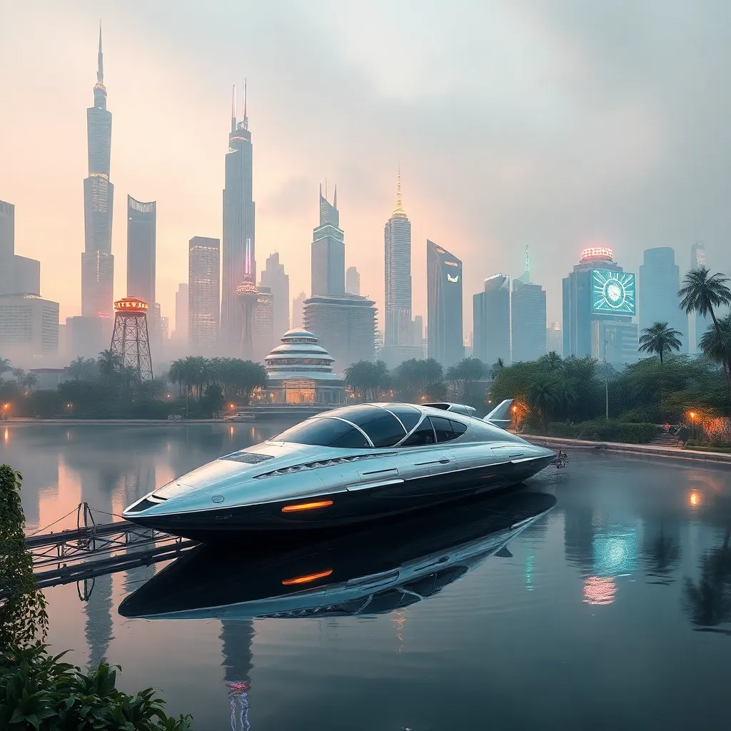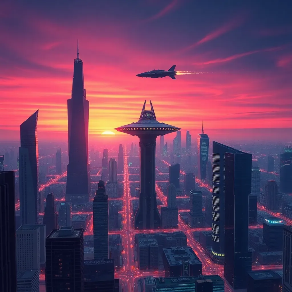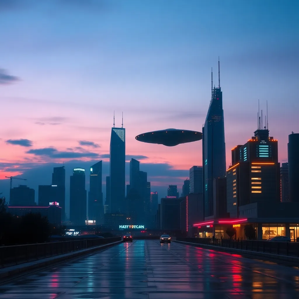 Imagine a futuristic cityscape at dusk, with sleek skyscrapers and neon lights reflecting off a misty lake. The city is surrounded by a lush forest, with a faint glow emanating from the trees. In the distance, a massive spaceship is docked, emitting a soft hum. Generate an image that captures this scene.