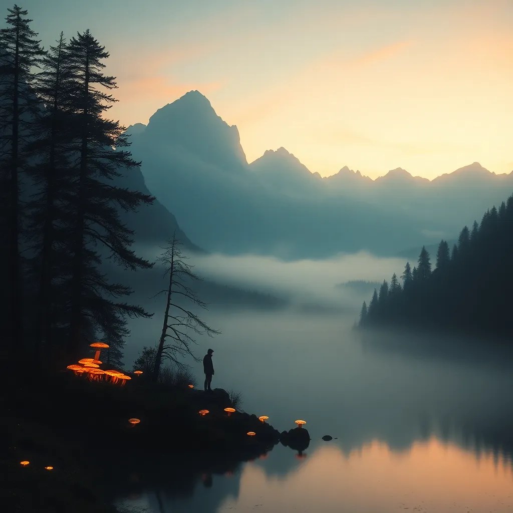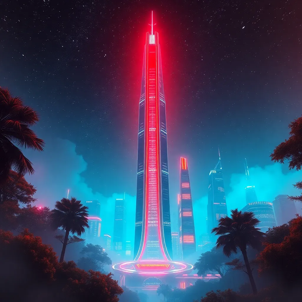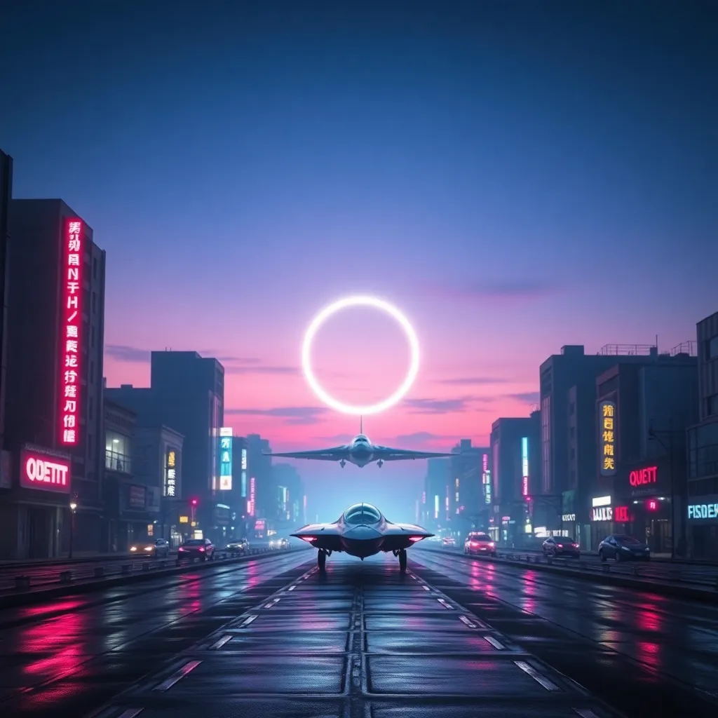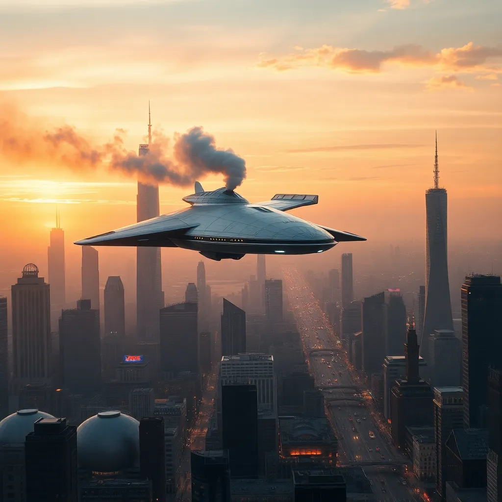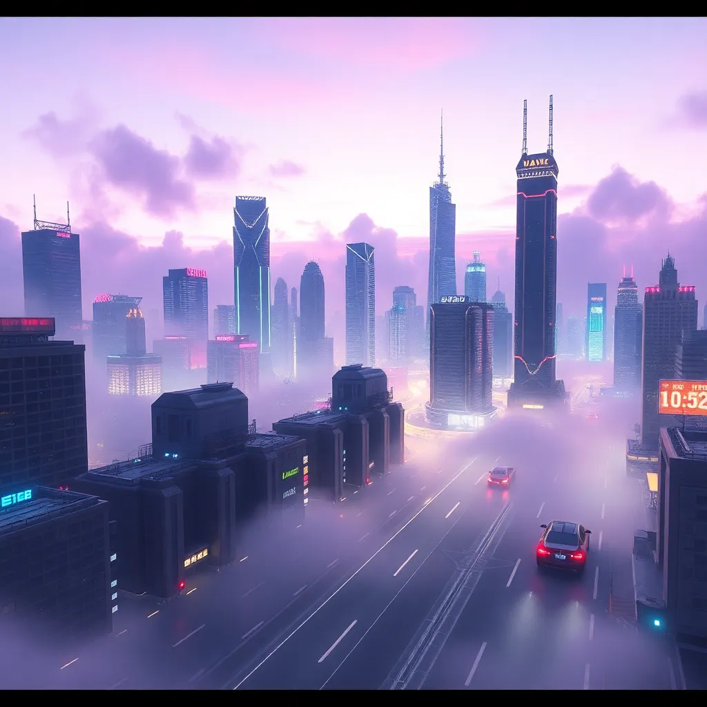 Imagine a futuristic cityscape at dusk, with sleek skyscrapers and neon lights reflecting off a misty lake. The city is surrounded by a lush forest, with a faint glow emanating from the trees. In the distance, a massive spaceship is docked, emitting a soft hum. Generate an image that captures this scene.