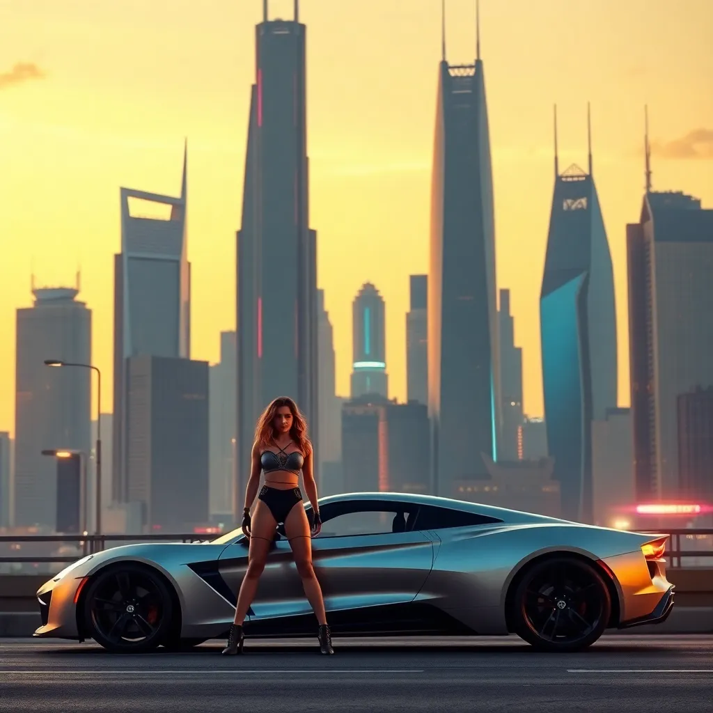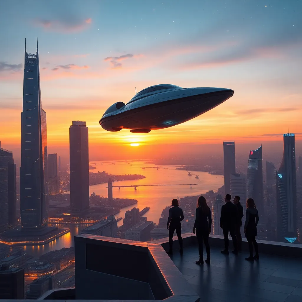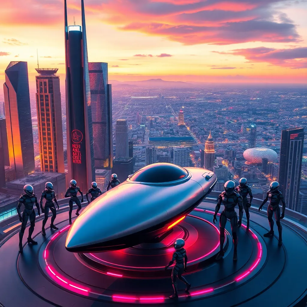 Generate an image of a futuristic cityscape at sunset, with sleek skyscrapers, neon lights, and a sprawling metropolis in the background. In the foreground, a sleek, silver bullet-shaped spacecraft is landing on a hoverpad, surrounded by a group of futuristic, robotic beings in various poses and expressions.