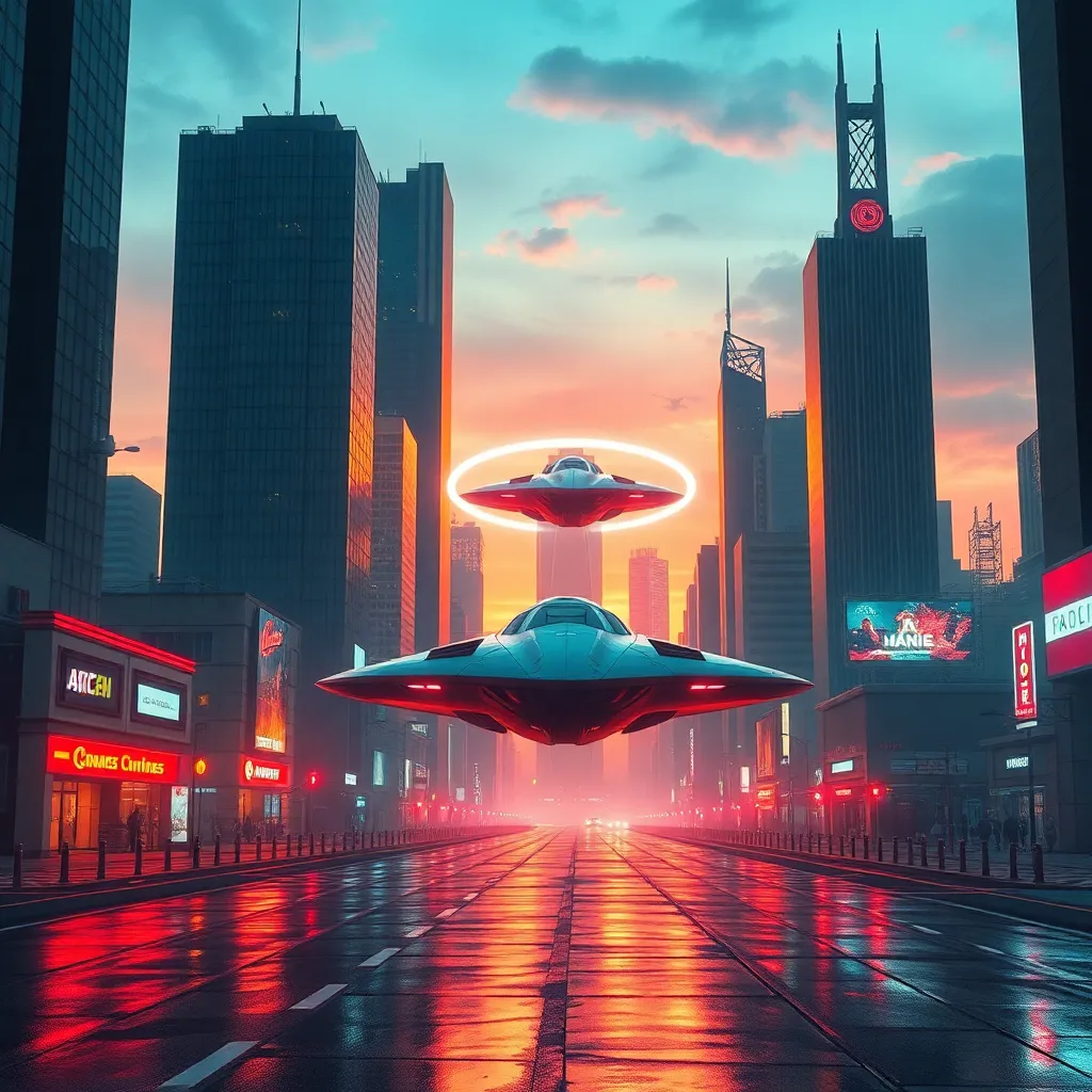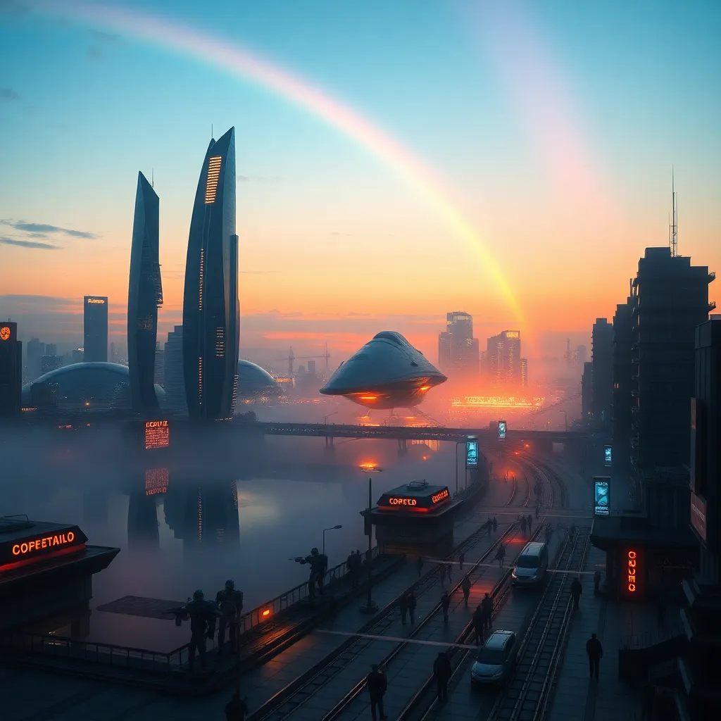 Imagine a futuristic cityscape at dusk, with sleek skyscrapers and neon lights reflecting off a misty lake. In the distance, a giant spaceship is docked, emitting a warm glow. The city streets are bustling with humans and robots, while a bright rainbow arcs across the sky. Generate an image that captures this vibrant scene.