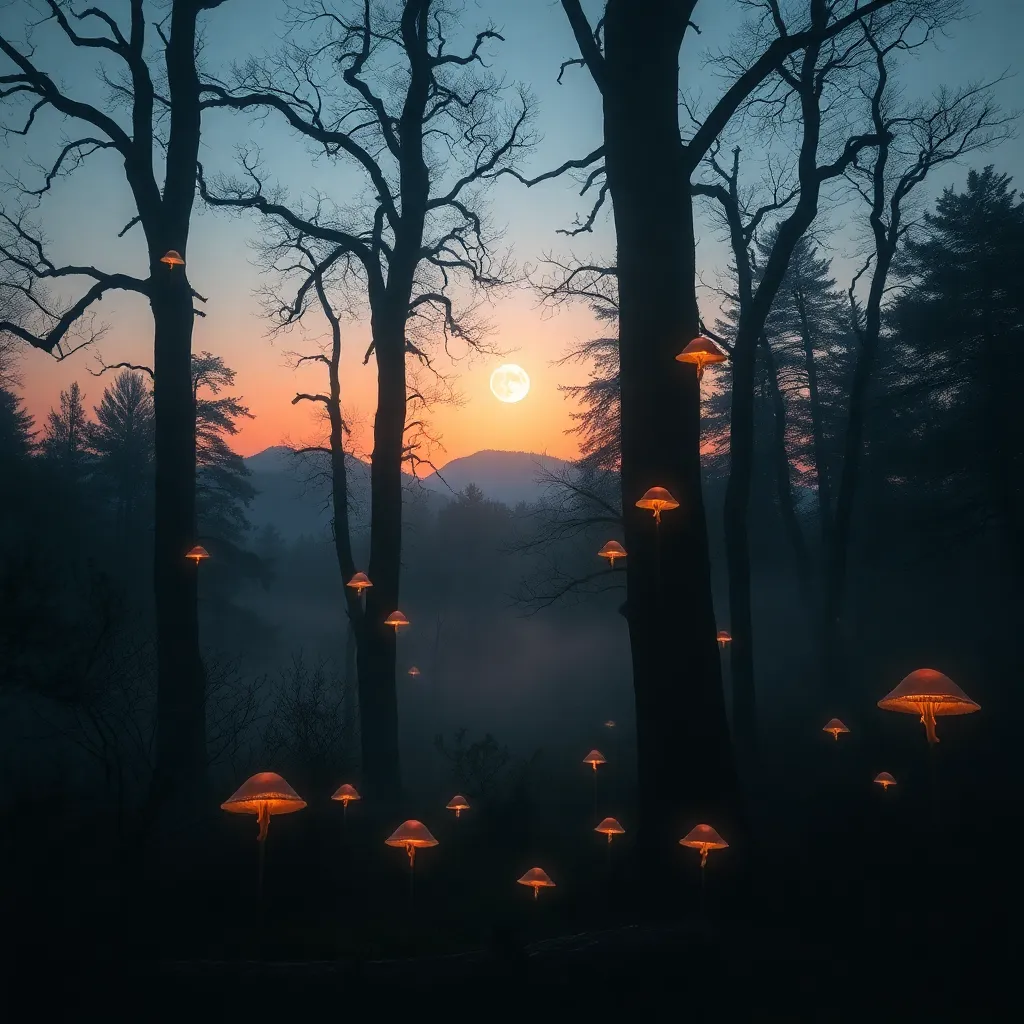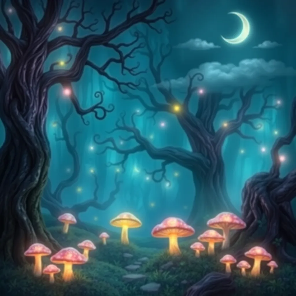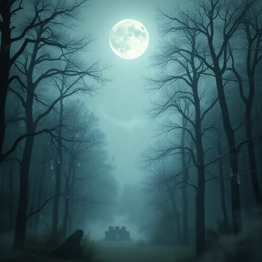 Create an ethereal landscape with a mystical glow. Imagine a dense forest with towering trees, their branches adorned with sparkling crystals. A full moon hangs low in the sky, casting a silver light on the misty atmosphere. Incorporate subtle wisps of fog and a hint of ancient ruins in the distance.