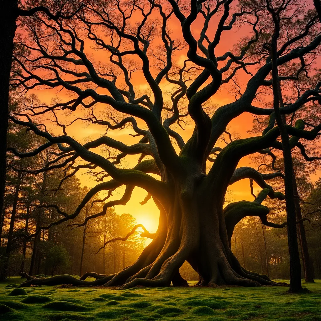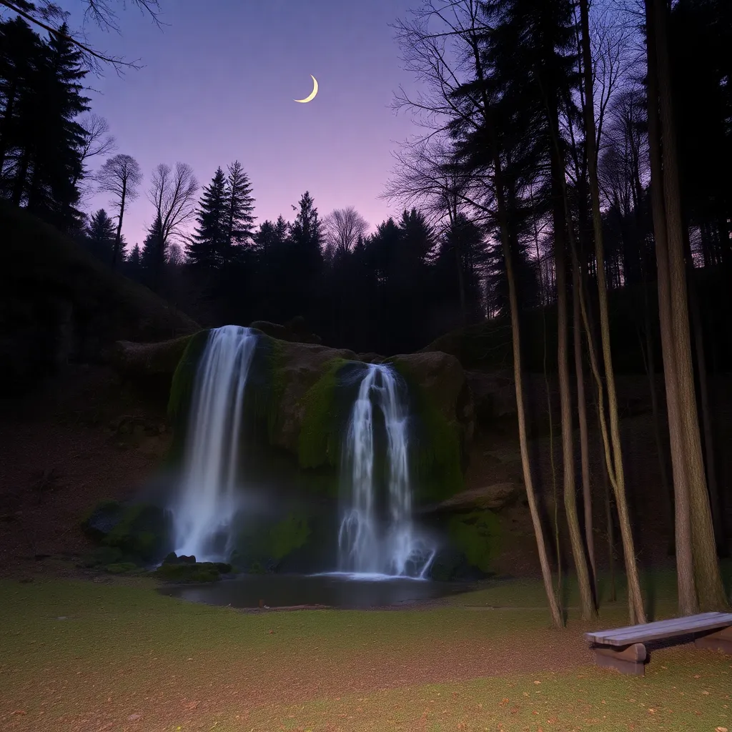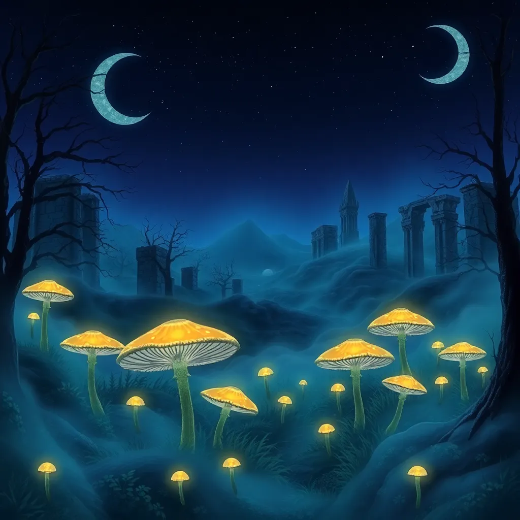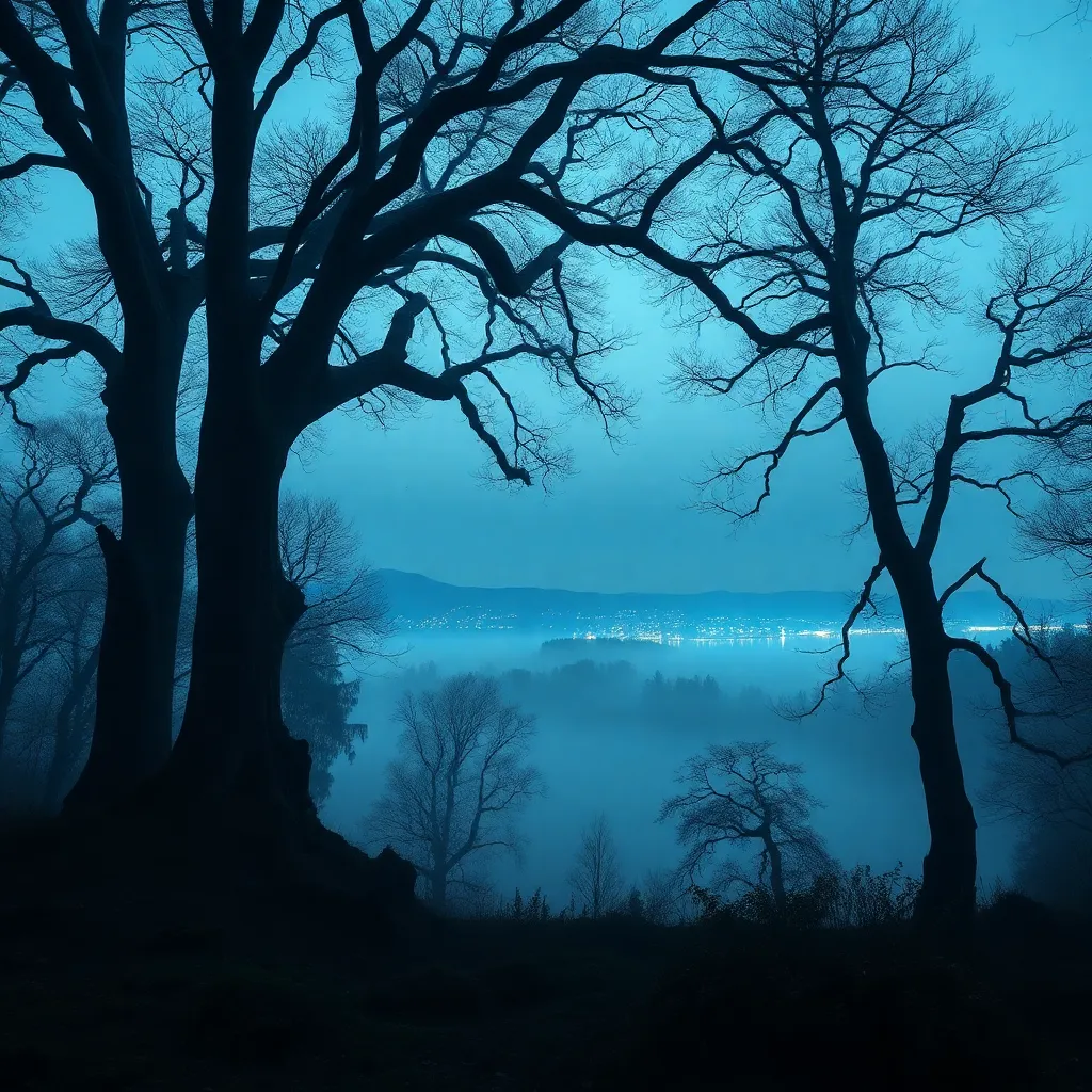 Create an ethereal landscape with a mystical glow. Imagine a dense forest with towering trees, their branches adorned with sparkling crystals. A full moon hangs low in the sky, casting a silver light on the misty atmosphere. Incorporate subtle wisps of fog and a hint of ancient ruins in the distance.
