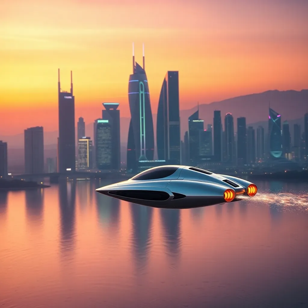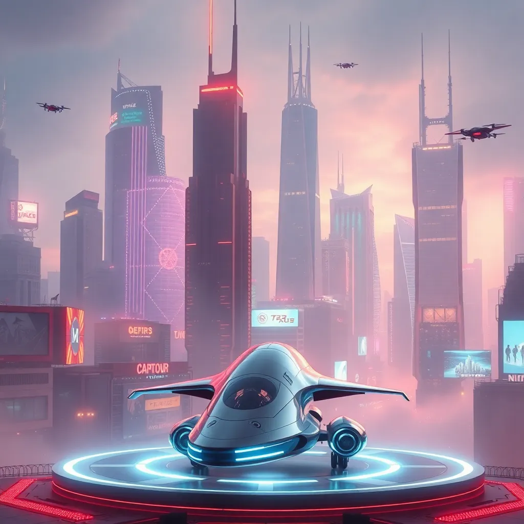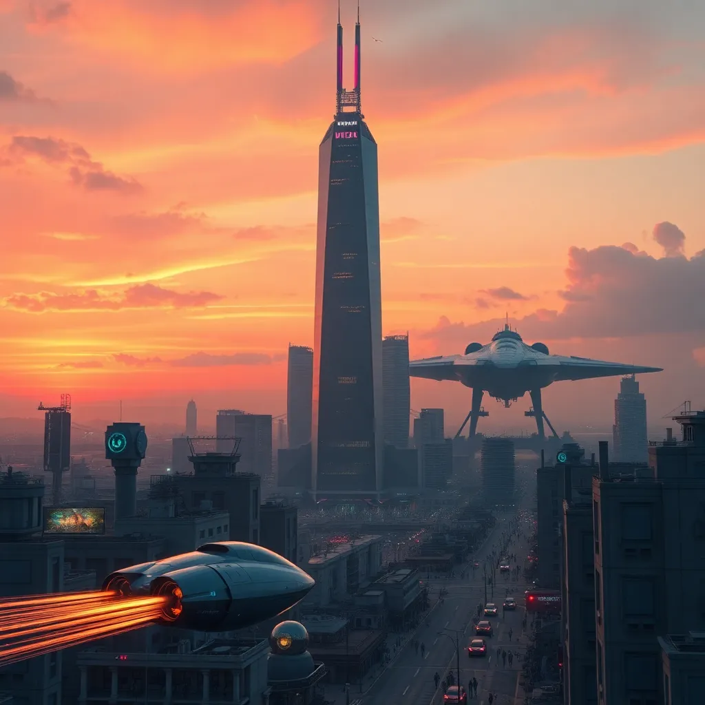 Create a futuristic cityscape at sunset with sleek skyscrapers, neon lights, and a sprawling metropolis. The sky should be a warm orange-pink hue with wispy clouds. Incorporate a hovercar or flying taxi hovering above the city, and add a few pedestrians walking along the sidewalk. Make the background futuristic and vibrant.