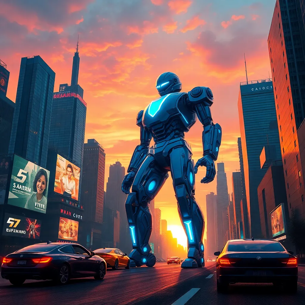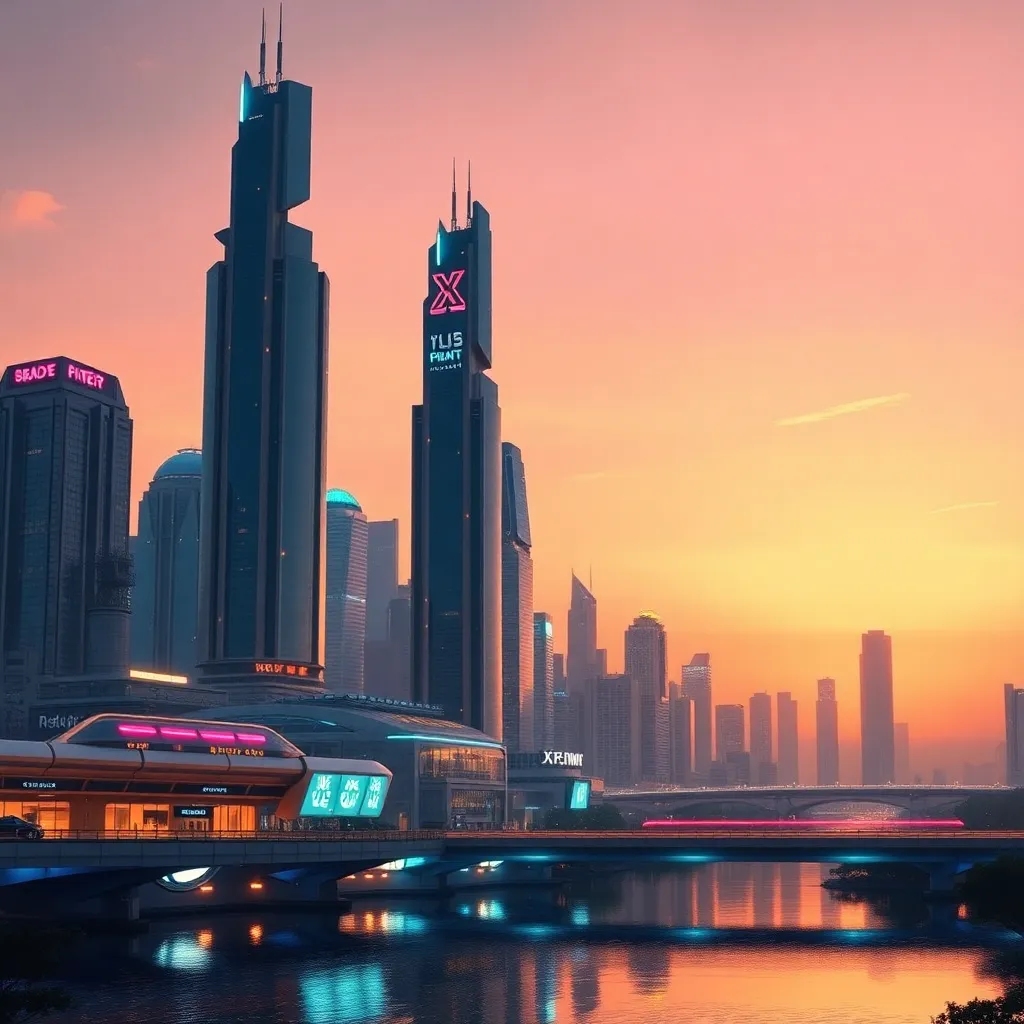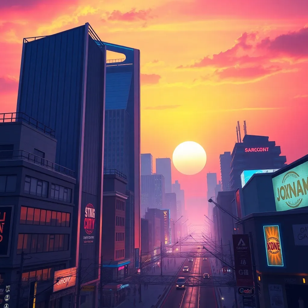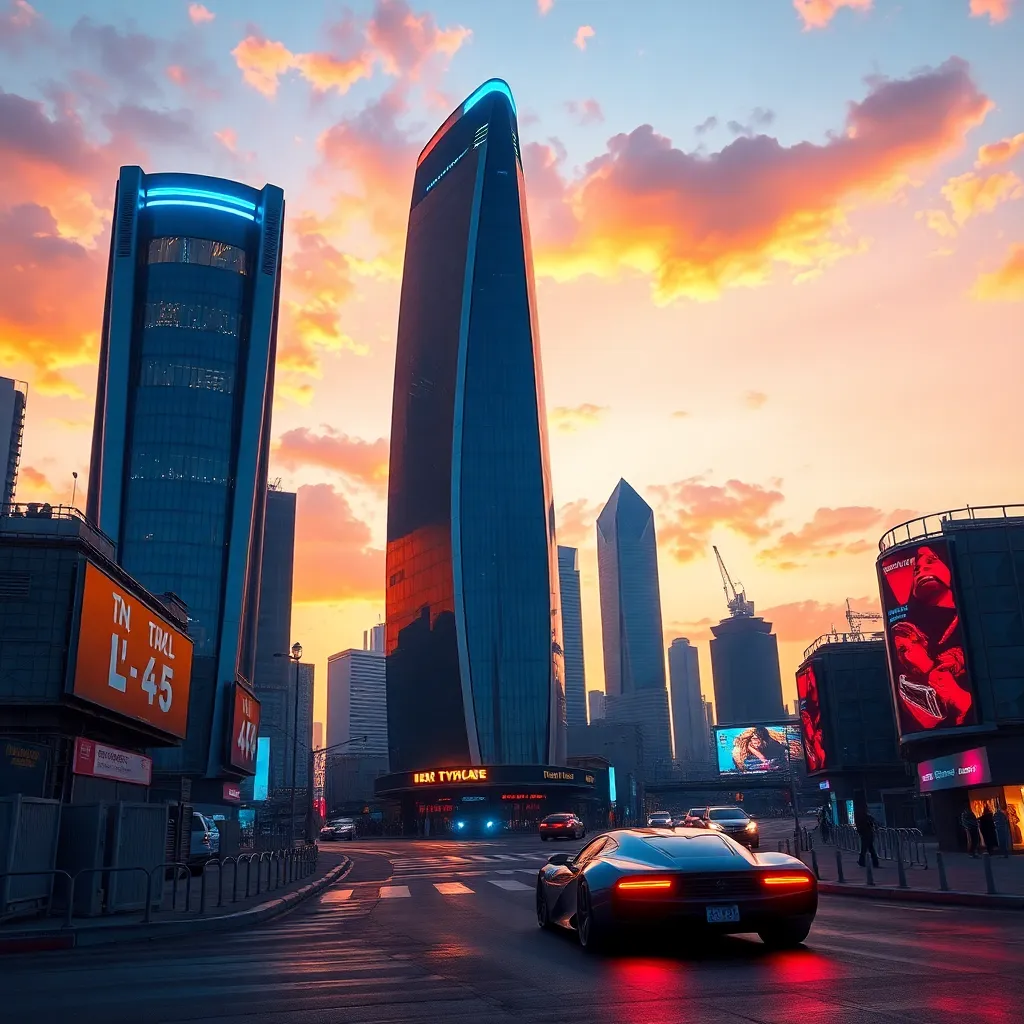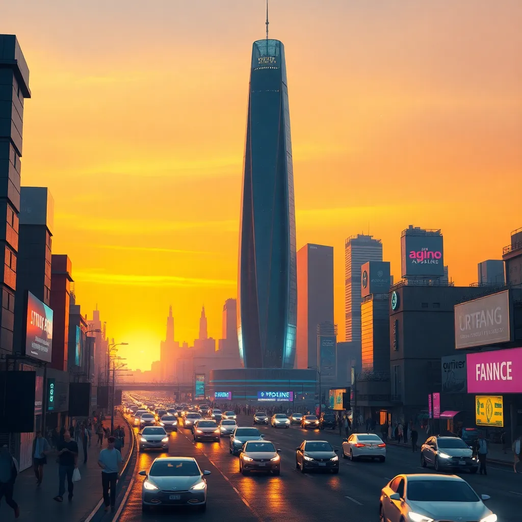 Create a futuristic cityscape at sunset with a sleek, silver skyscraper in the center, surrounded by a bustling street with flying cars and pedestrians. The sky should be a warm orange hue with a subtle gradient effect, and the city lights should be softly glowing. Incorporate neon signs and billboards.