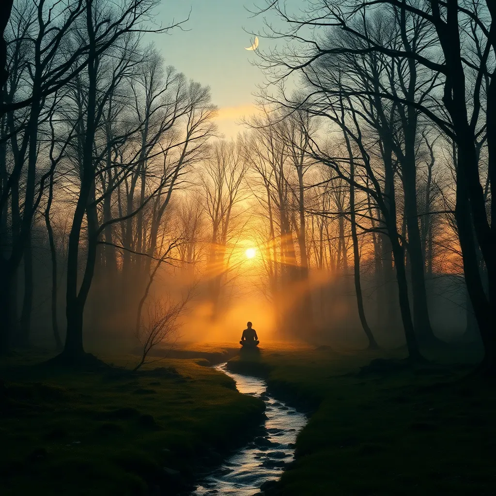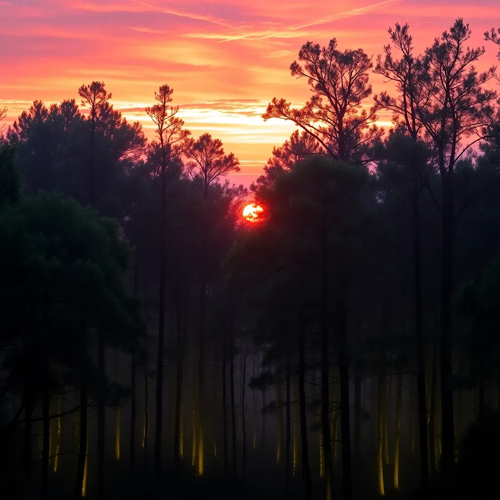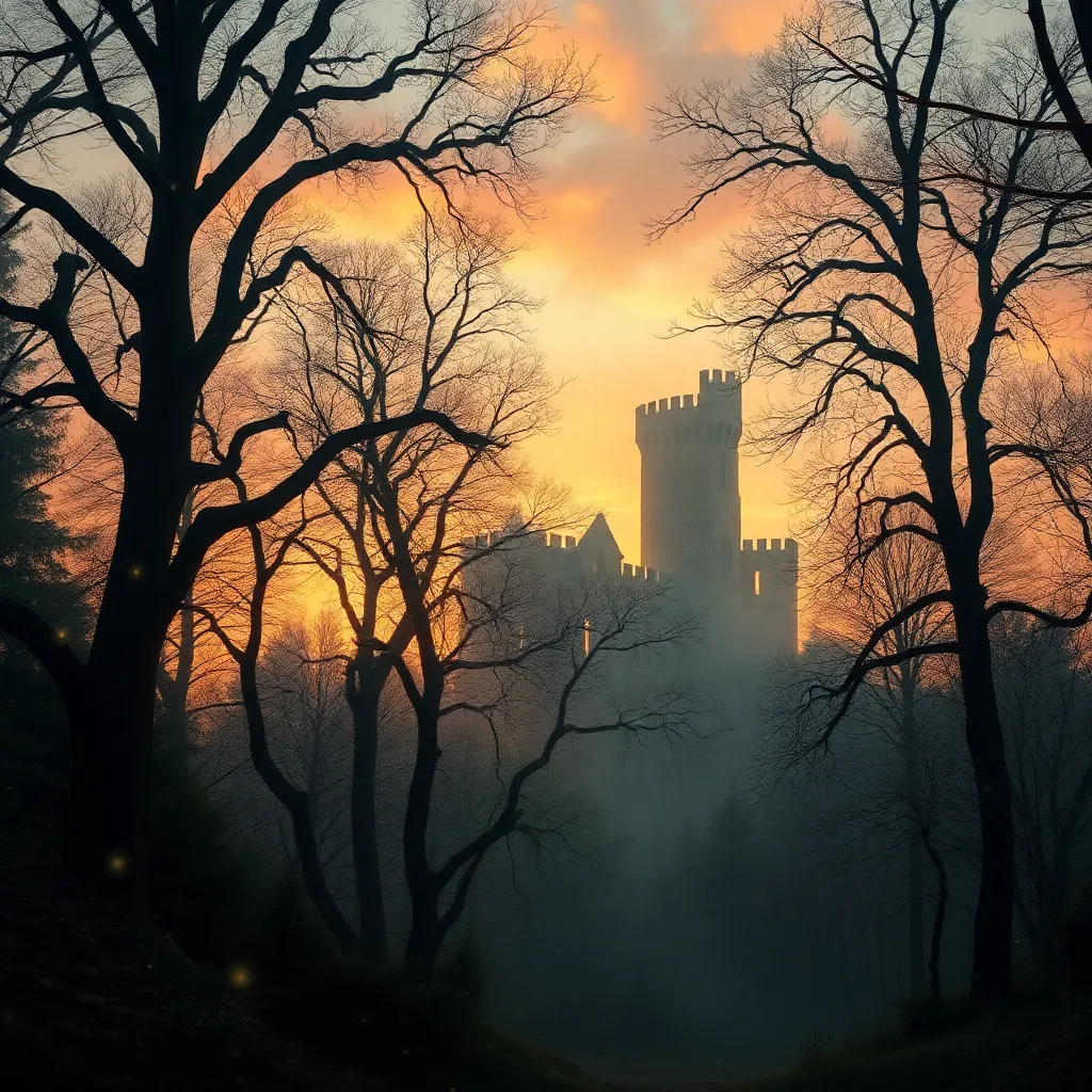 Imagine a mystical forest at sunset, with towering trees adorned with glowing fireflies and a misty veil hovering above. In the distance, a ancient, crumbling castle stands tall, its stones infused with a soft, ethereal glow. The atmosphere is serene, yet hints at secrets and mysteries waiting to be uncovered.