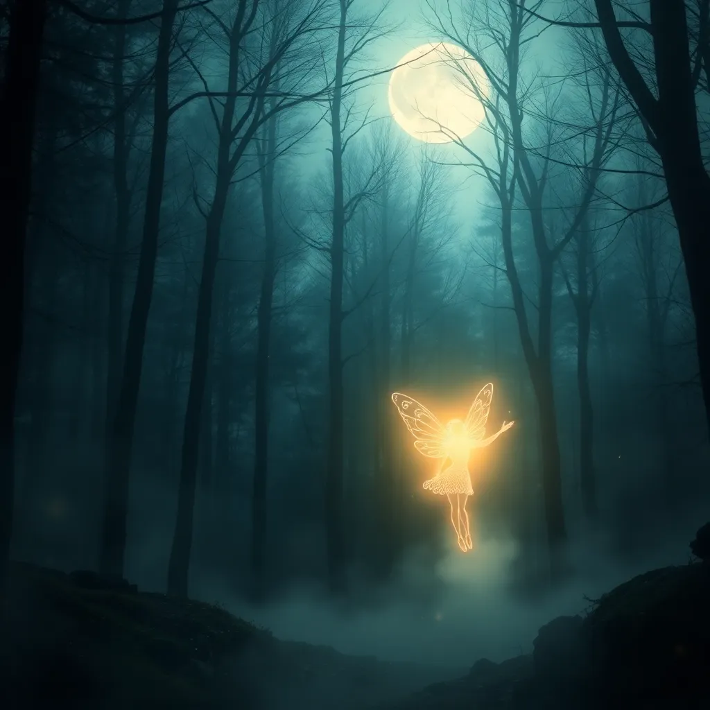 Create an ethereal scene with a wispy, moonlit forest as the background. A lone, glowing fairy stands amidst the trees, surrounded by a halo of soft, shimmering light. The atmosphere is mystical and dreamy, with misty fog swirling at the forest floor. Incorporate subtle, shimmering effects for added depth.