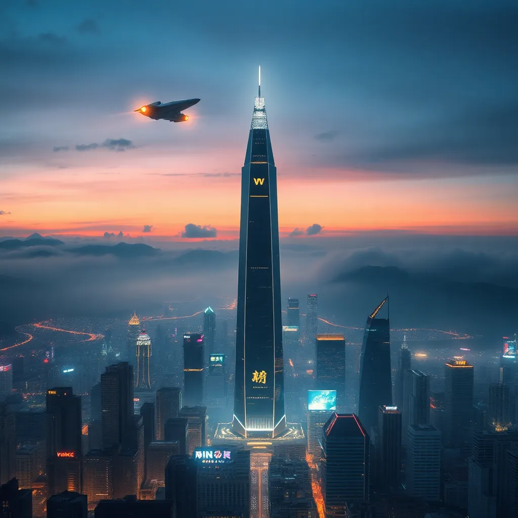 Create an atmospheric image of a futuristic cityscape at dusk. A sleek, silver skyscraper dominates the center, surrounded by misty mountains and a sprawling metropolis. Neon lights and holographic advertisements illuminate the darkening sky, while a lone spaceship descends from the clouds, casting a warm glow on the city below.