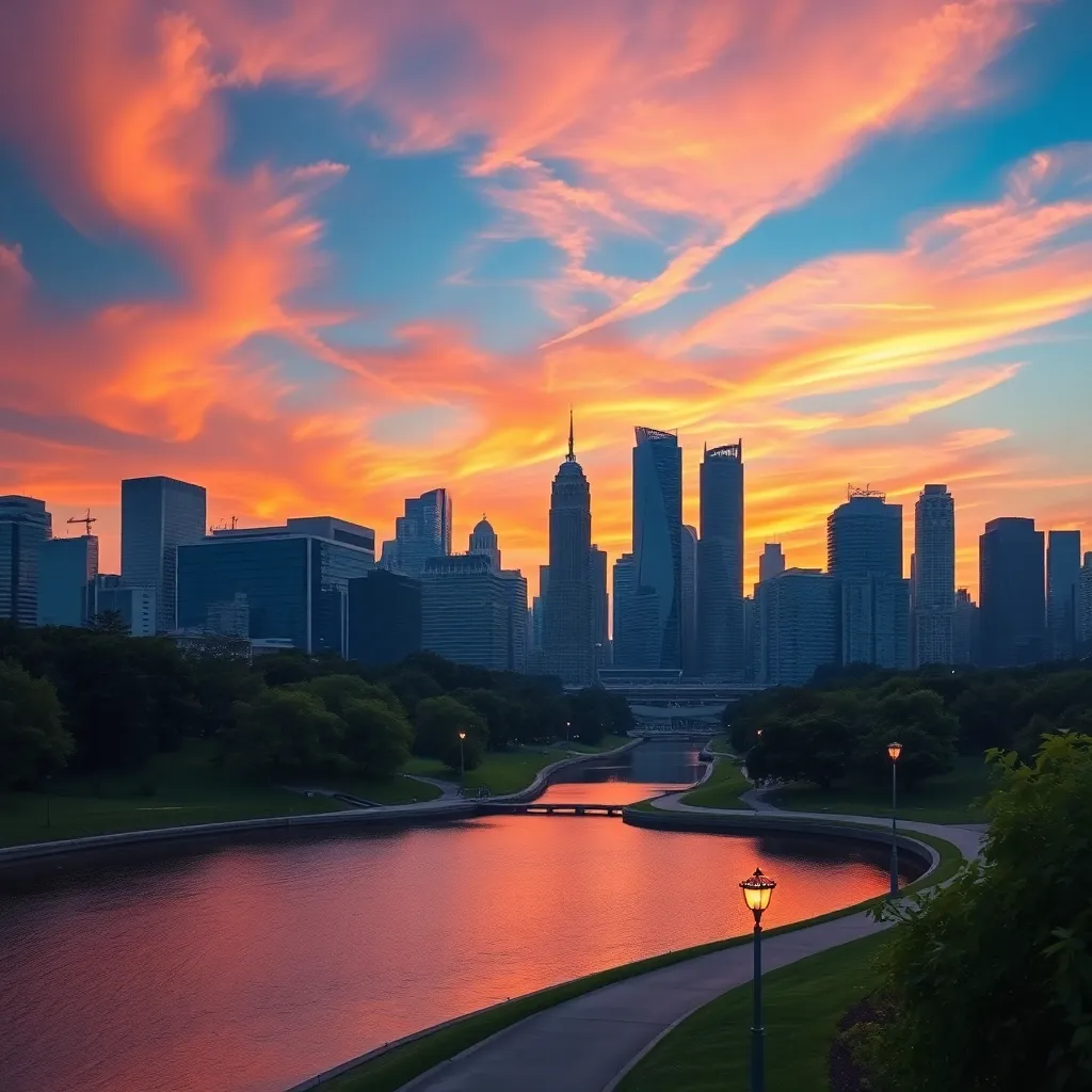 Create an ethereal cityscape at sunset, with towering skyscrapers and lush greenery, set against a vibrant orange and pink sky with wispy clouds, and a serene lake in the foreground, surrounded by a meandering path and a few strategically placed streetlights, capturing the essence of a peaceful evening atmosphere.