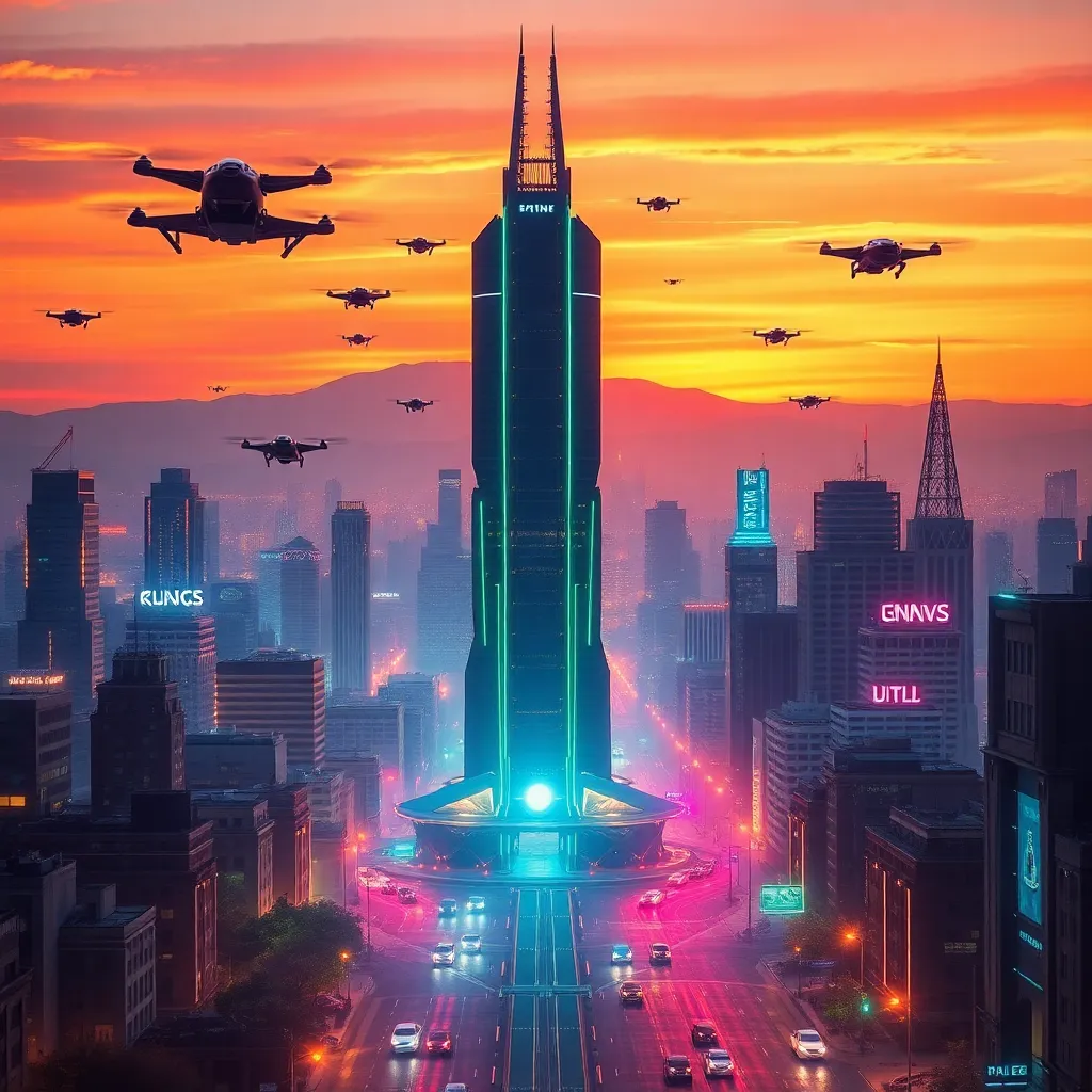 Create a futuristic cityscape at sunset with a massive skyscraper in the center, surrounded by sleek flying cars and hovering drones. Incorporate vibrant neon lights, glowing streetlights, and a majestic mountain range in the distance. Use a mix of earthy tones and neon colors to capture the city's dynamic energy.