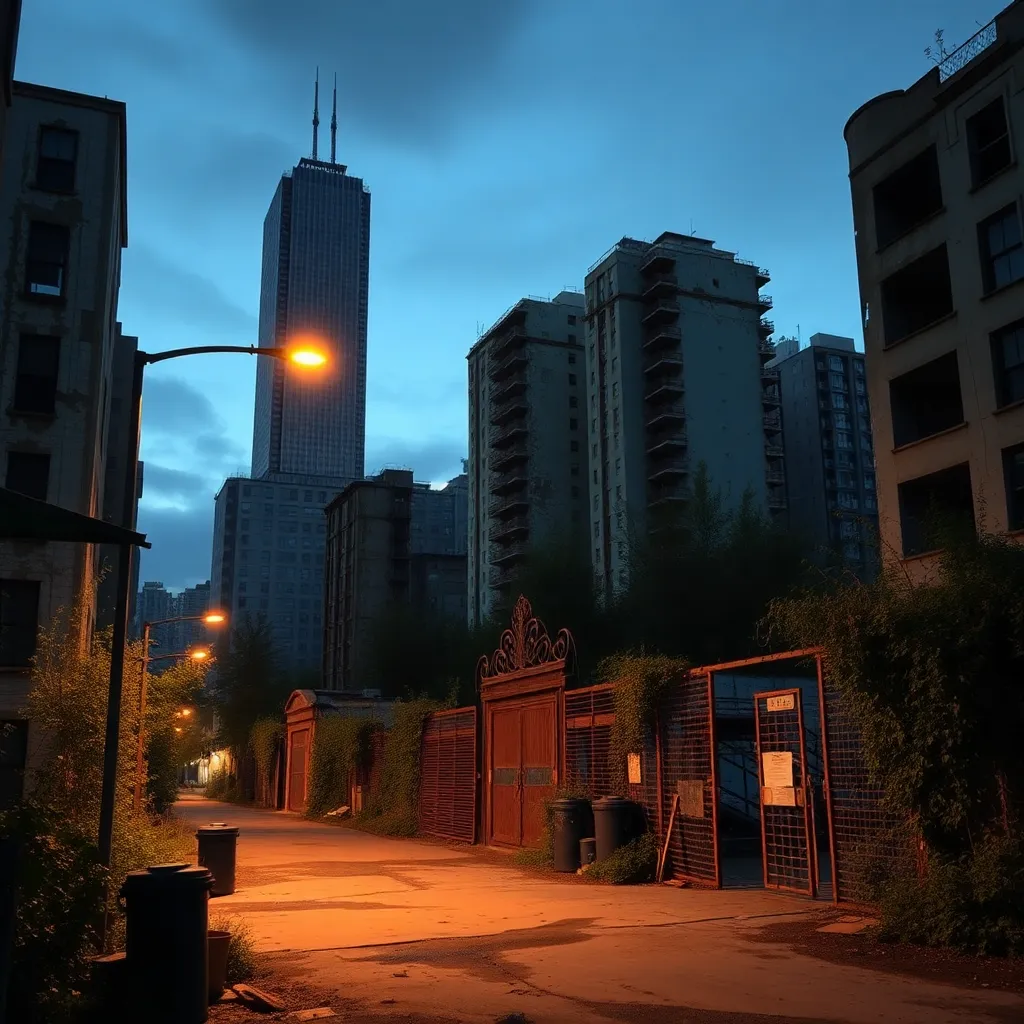 Create an eerie abandoned cityscape at dusk, with crumbling skyscrapers, overgrown streets, and a lone streetlight casting an orange glow. Incorporate a sense of decay and neglect, with peeling paint, rusty gates, and a few scattered trash cans. Use a muted color palette with shades of blue, gray, and orange.