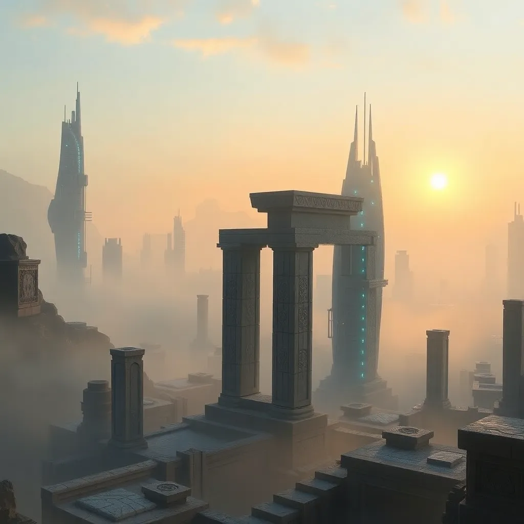 Create an otherworldly landscape where ancient ruins blend seamlessly with futuristic architecture. Imagine a misty dawn breaking over a sprawling metropolis, with ancient stone structures rising from the fog like sentinels, their intricate carvings glowing with an ethereal blue light amidst a backdrop of towering skyscrapers.