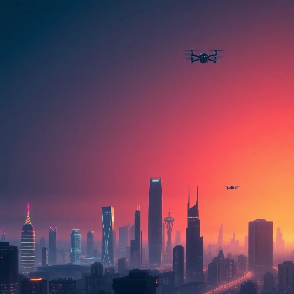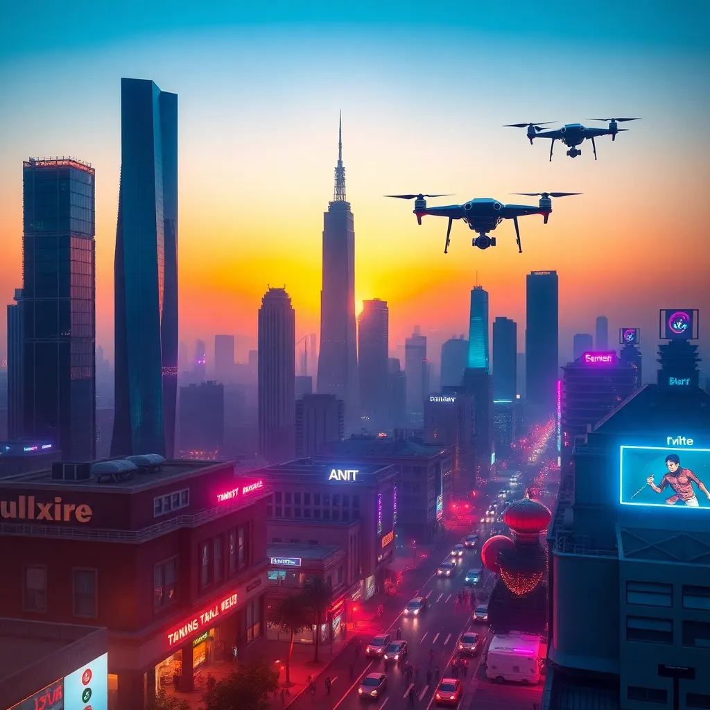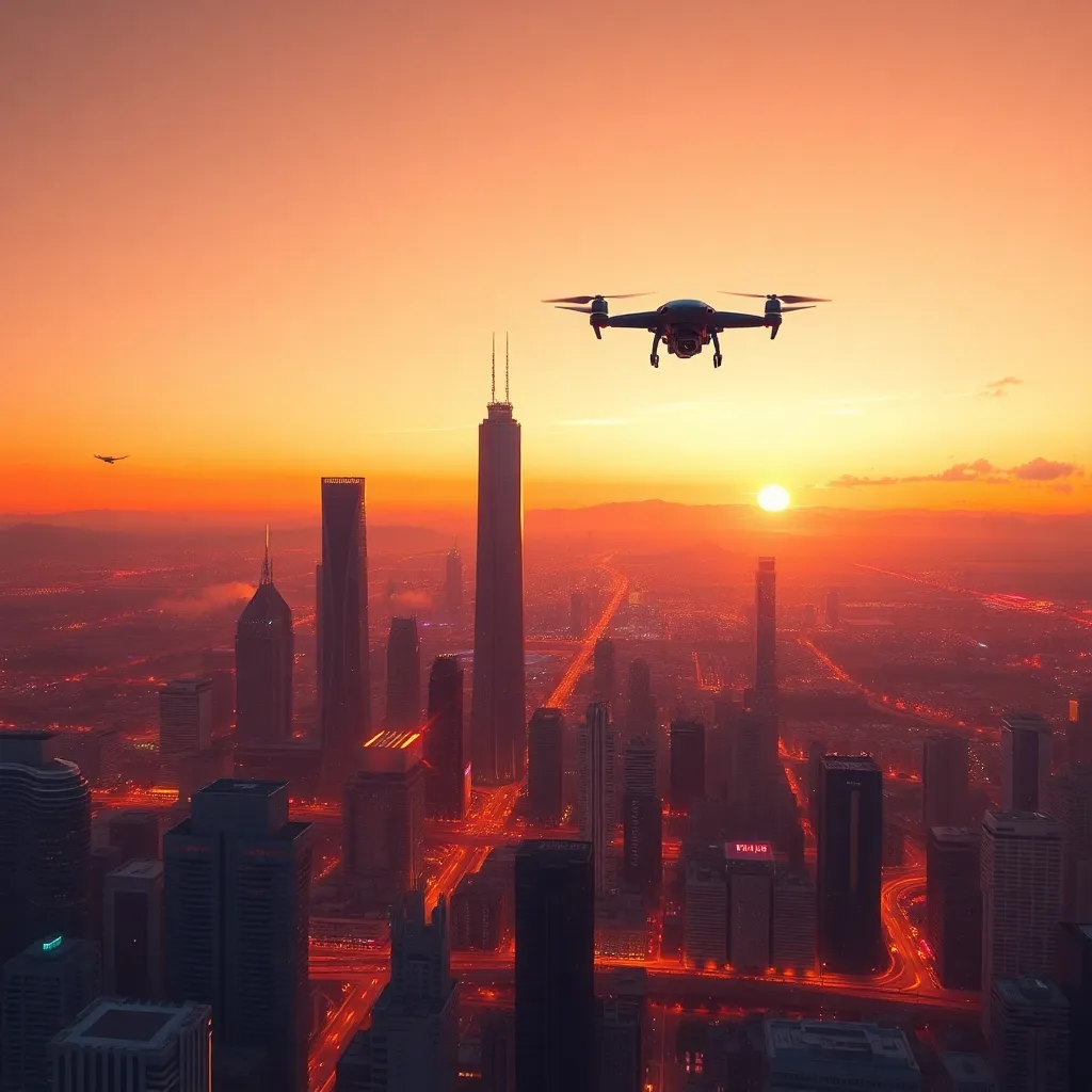 Create a futuristic cityscape at sunset with a vibrant orange background, featuring sleek skyscrapers, hovering drones, and a sprawling metropolis. Incorporate neon lights, wispy clouds, and a subtle gradient effect to capture the warm, energetic atmosphere of a bustling city in the midst of a technological revolution.