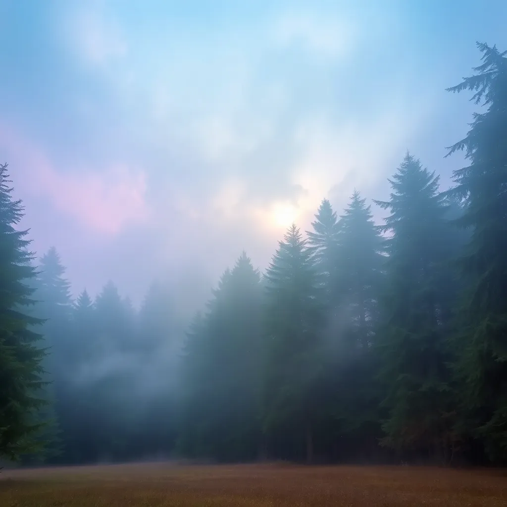 Create an ethereal landscape with a wispy, misty atmosphere. Imagine a serene forest clearing surrounded by towering trees, with a subtle gradient of blues and purples in the background. Incorporate soft, feathery clouds and a hint of golden sunlight filtering through the foliage. Use Background Color Changer to generate an AI image.