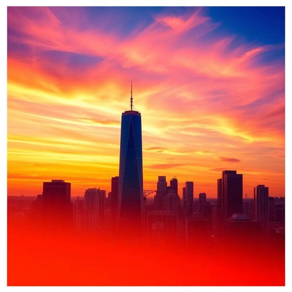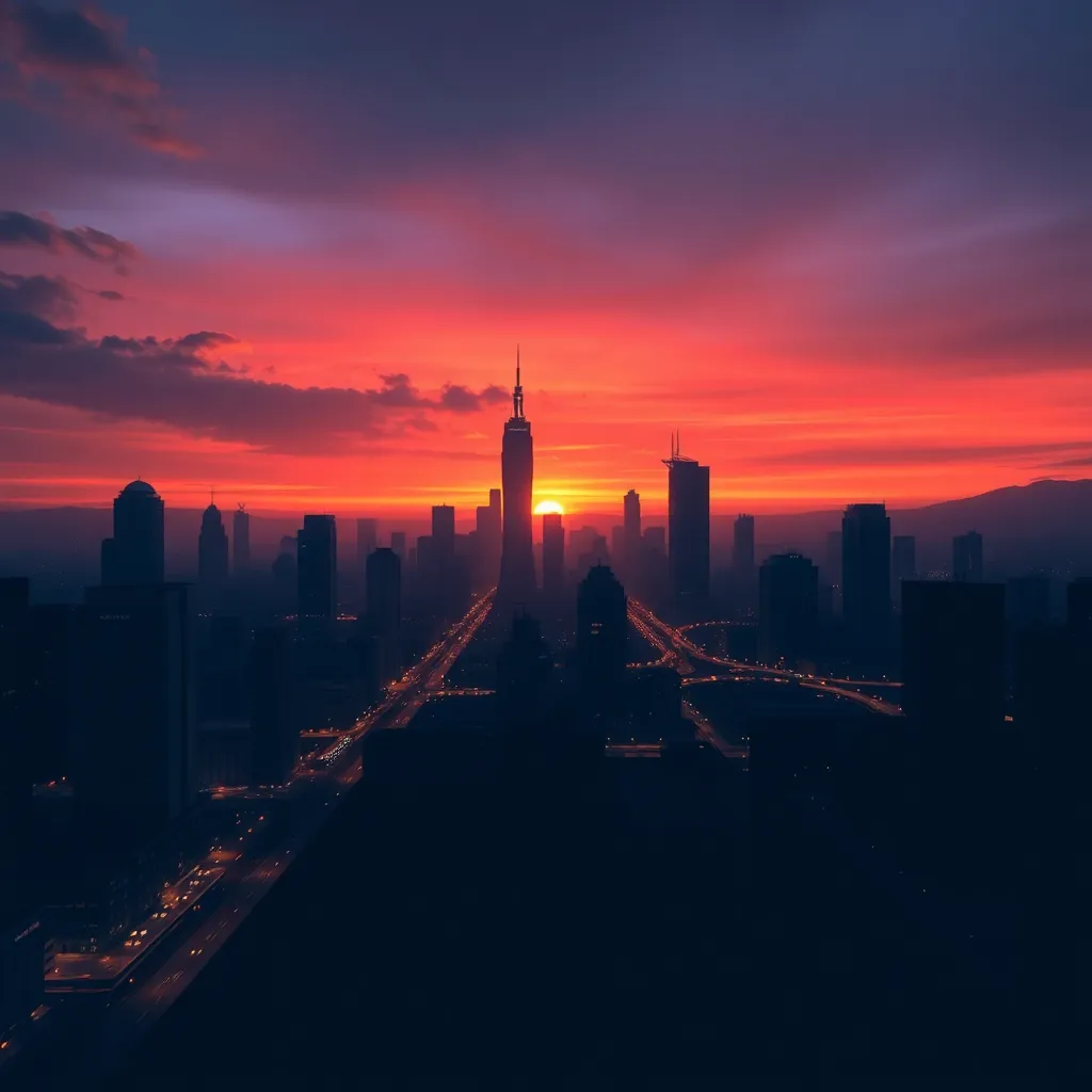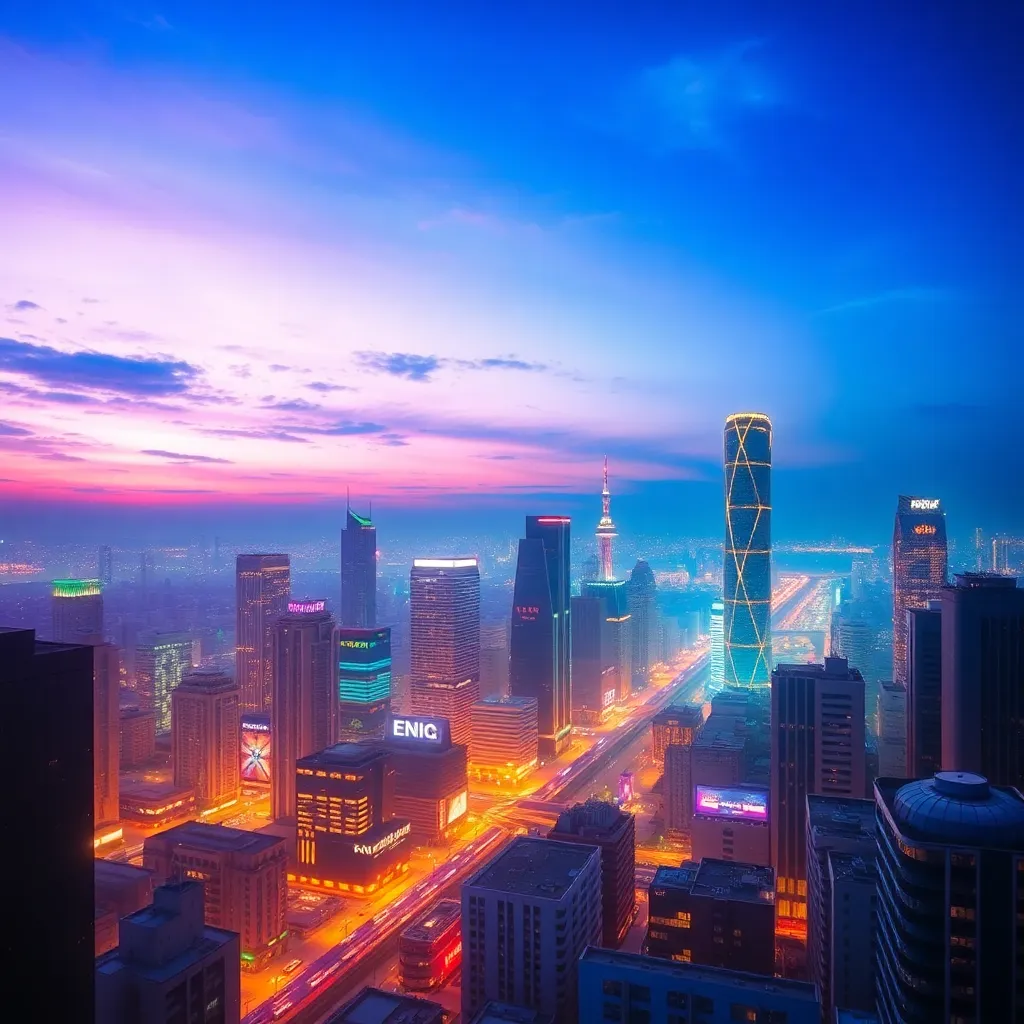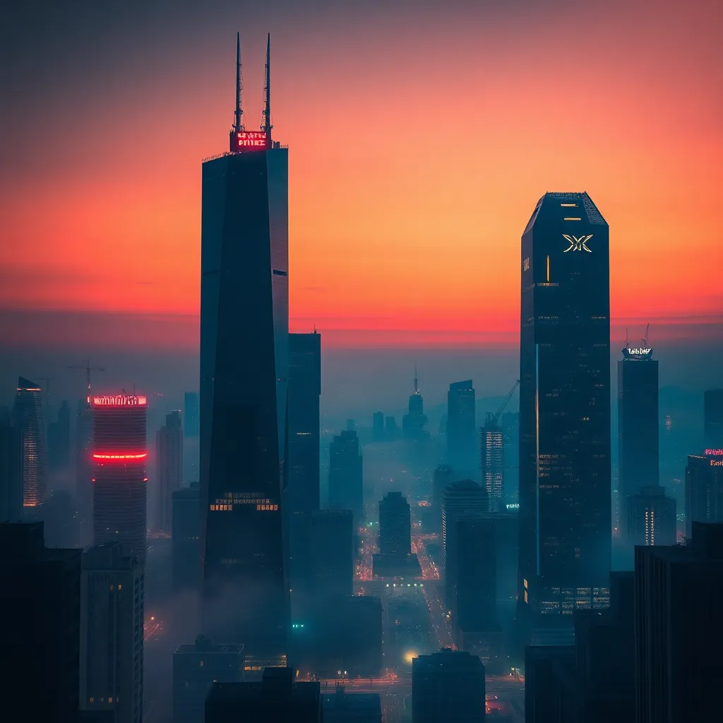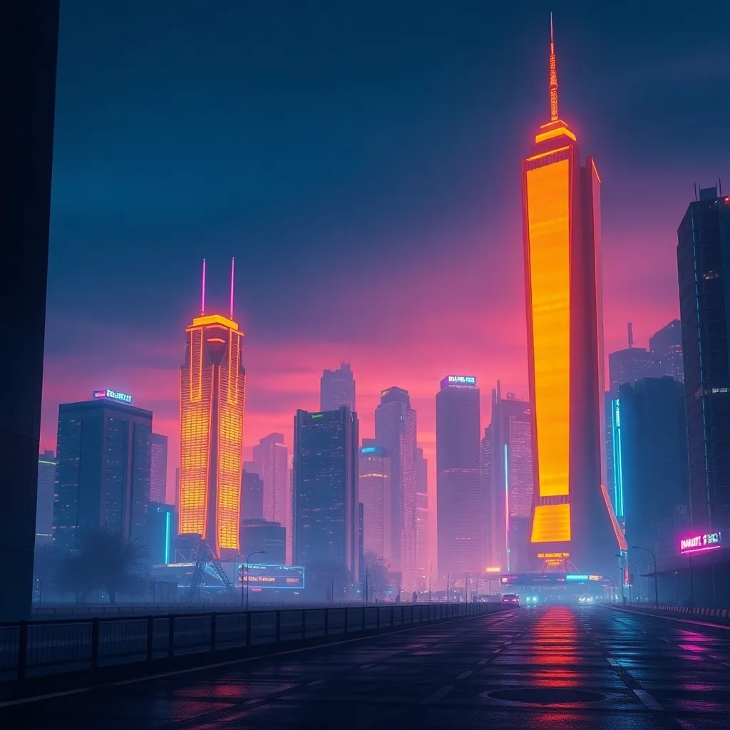 Imagine a futuristic cityscape at dusk, with towering skyscrapers and neon lights reflecting off a darkening sky. Generate an AI image with a gradient background that transitions from a deep indigo blue to a vibrant orange, evoking a sense of energy and excitement. Incorporate subtle city lights and misty fog.