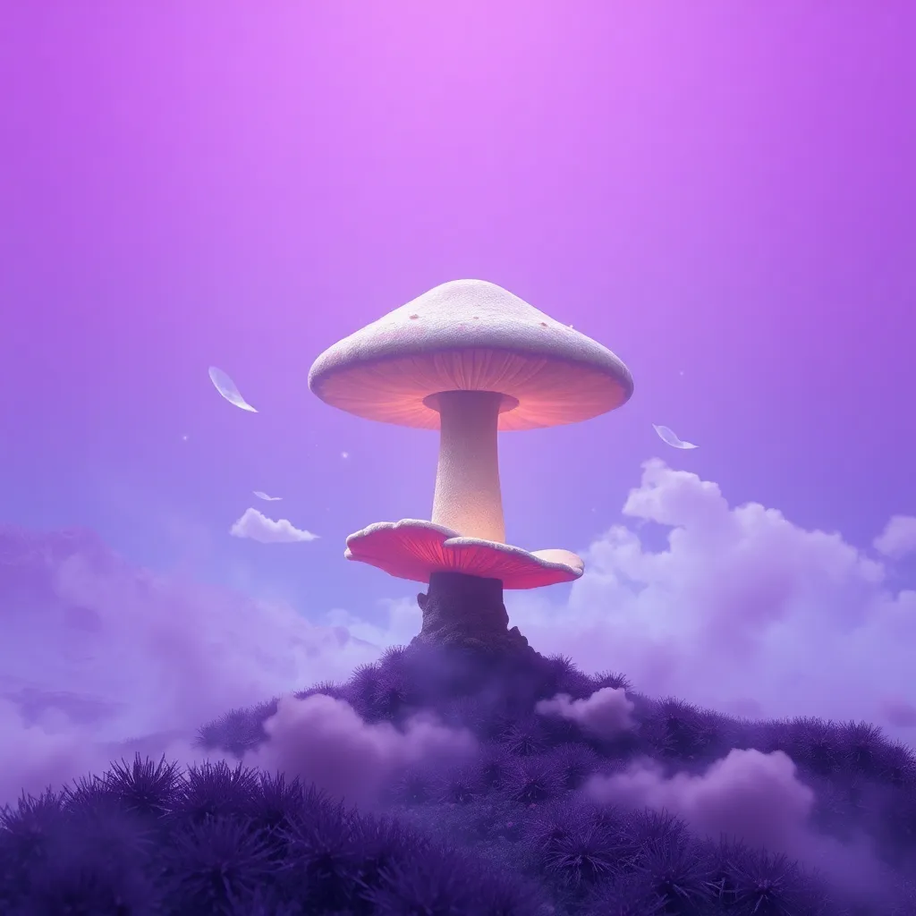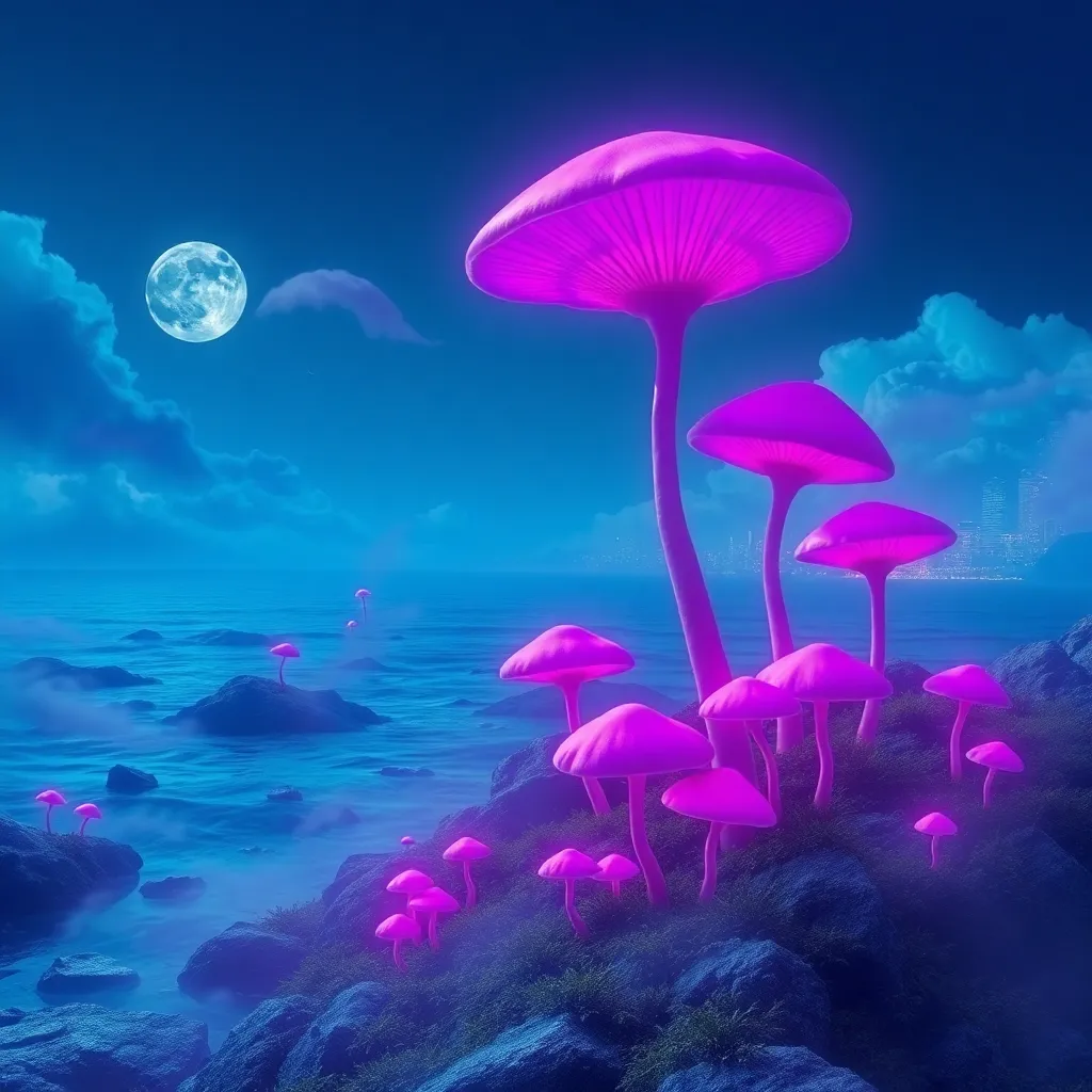 Create a surreal landscape with a deep blue background, reminiscent of a moonlit ocean. Incorporate glowing purple mushrooms, wispy clouds, and a distant cityscape with neon lights. Use a blend of organic and futuristic elements to create a dreamlike atmosphere. Generate an AI image that captures this ethereal scene.