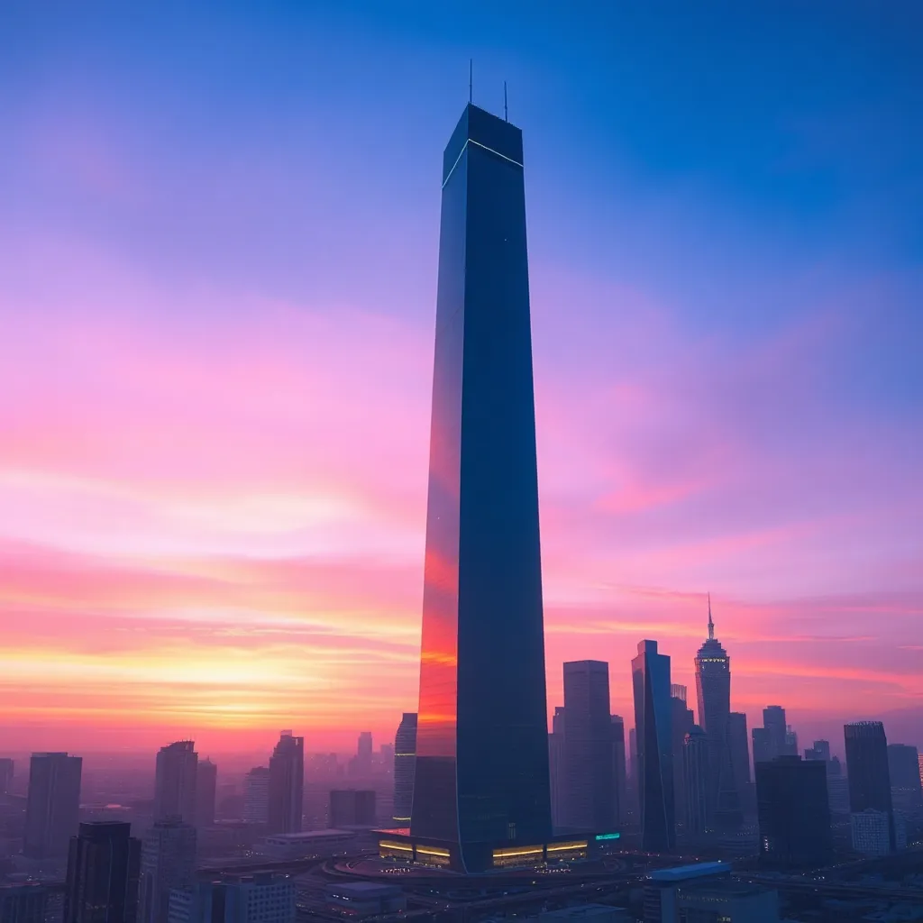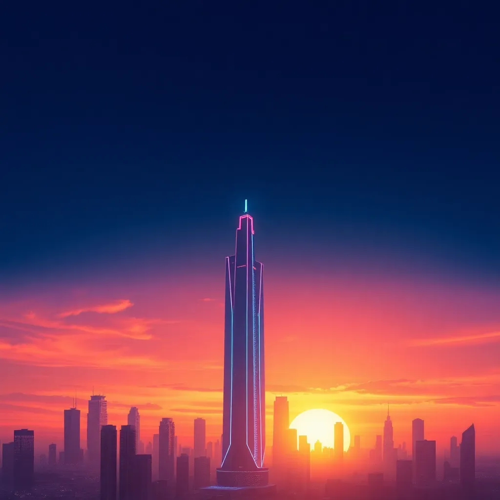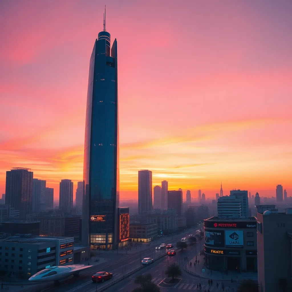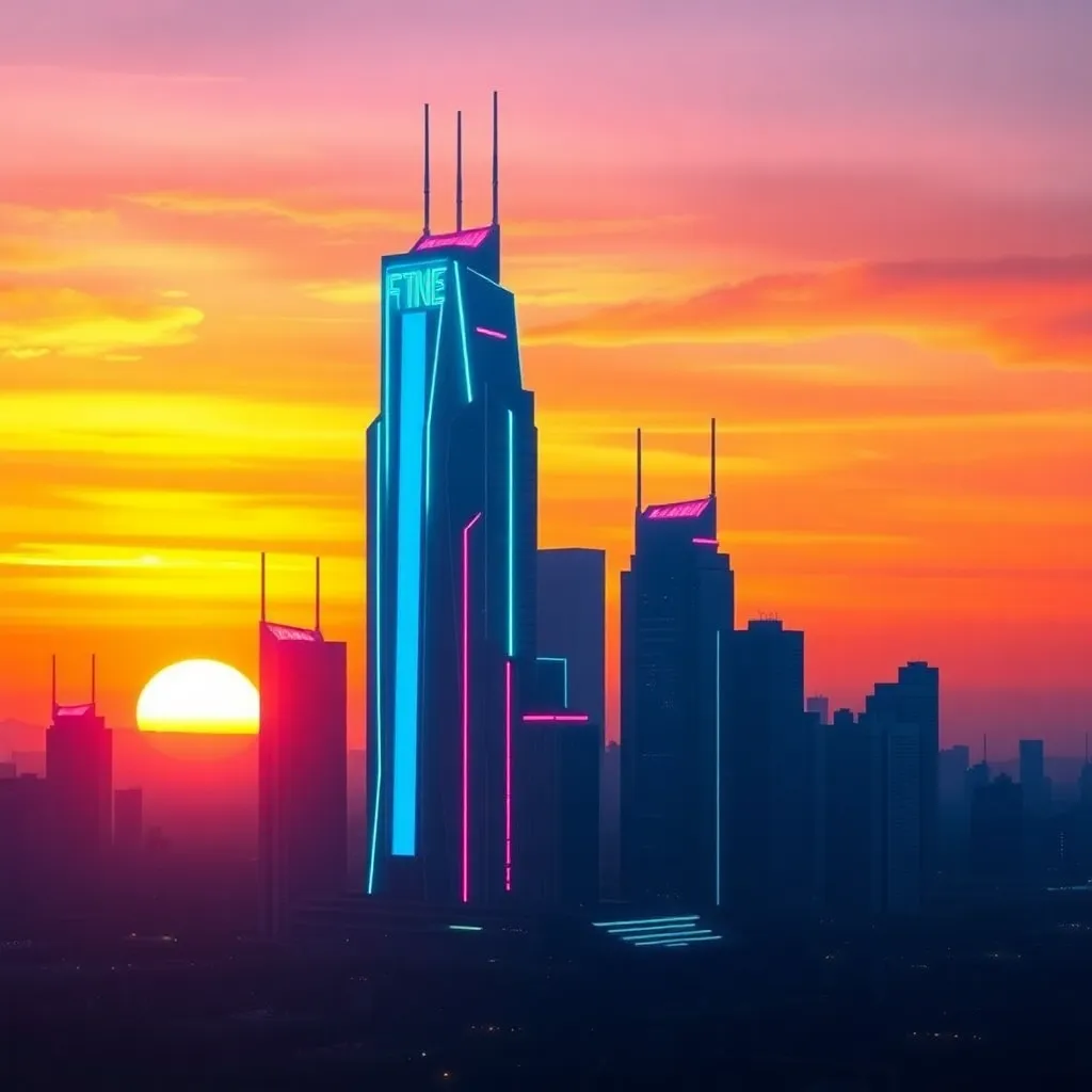 Create a futuristic cityscape at sunset, with a vibrant orange-pink sky and a sleek, high-tech skyscraper in the foreground. The building's facade should be a gradient of blues and silvers, with neon lights illuminating the windows. The city streets should be bustling with hovercars and pedestrians.