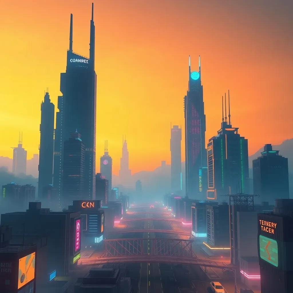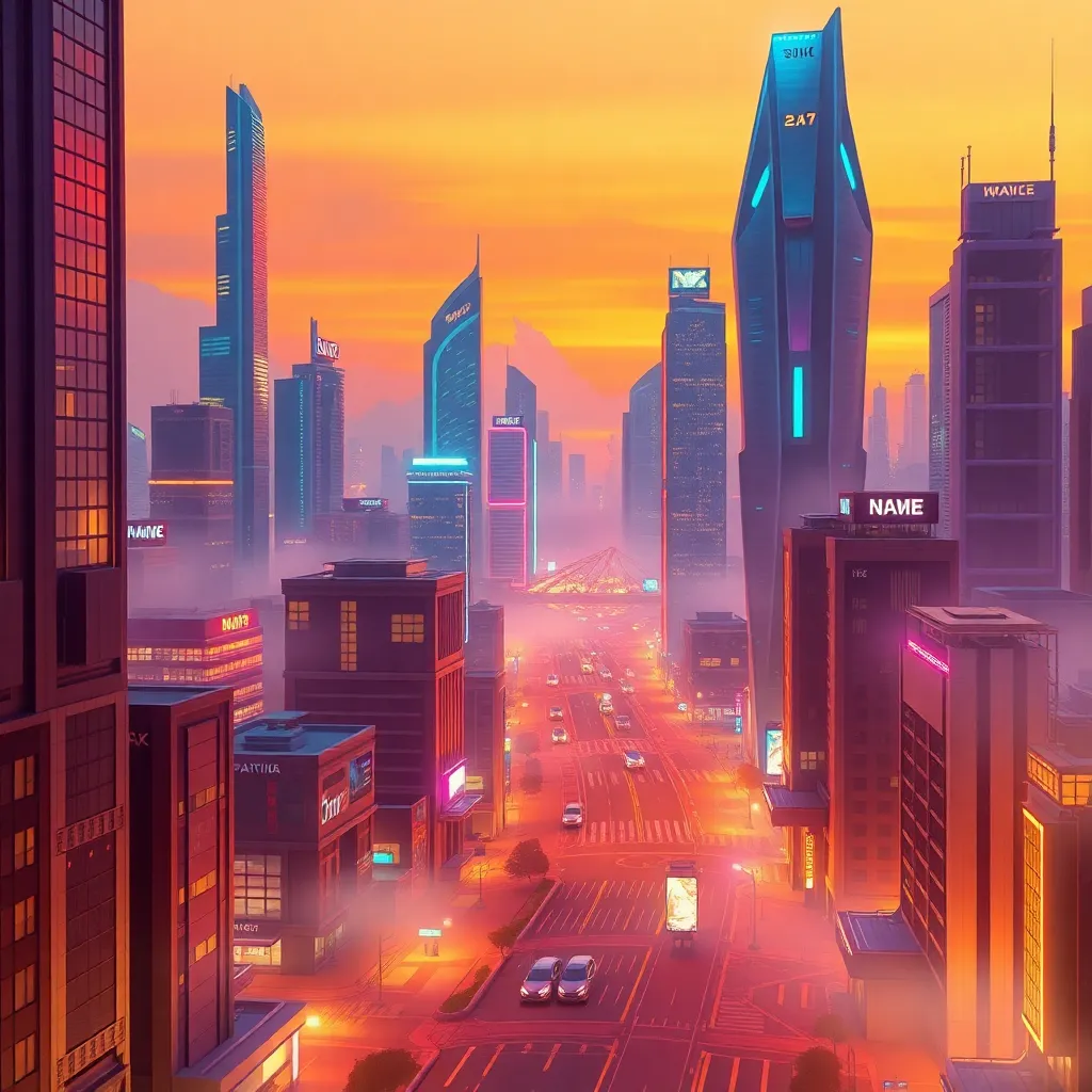 Create a futuristic cityscape at dusk with a warm, golden background. Incorporate sleek skyscrapers, neon-lit streets, and a hint of misty fog. The dominant color palette should be a gradient of oranges, yellows, and purples, with accents of deep blues and silvers. Generate an AI image that captures this vibrant atmosphere.