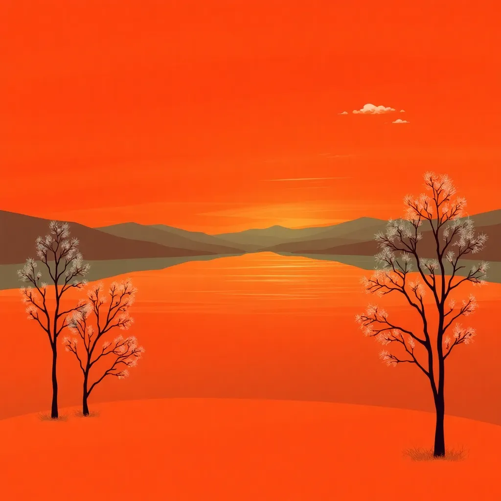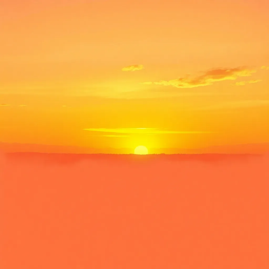 Create a stunning sunset landscape with a warm orange-yellow background. Replace the original sky with a vibrant gradient of hues, transitioning from deep oranges to soft pinks. Add a few wispy clouds and a subtle haze to enhance the atmosphere. Use a mix of textures and brushstrokes to give it a dreamy, ethereal quality.