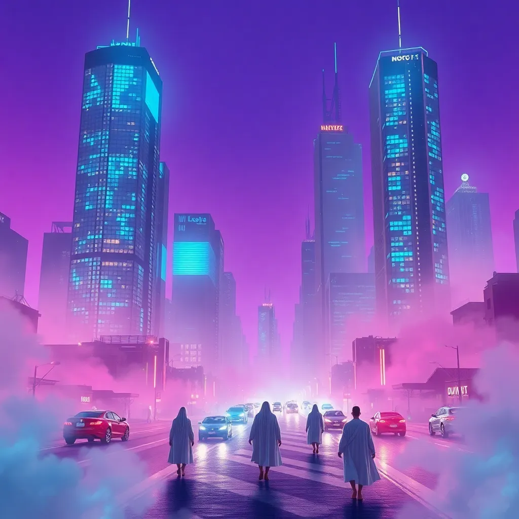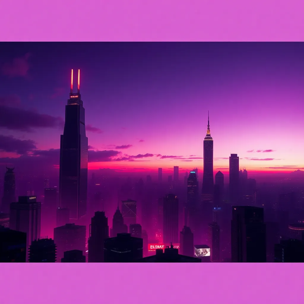 Create a surreal cityscape at dusk with a vibrant purple background. Incorporate towering skyscrapers, glowing neon lights, and wispy clouds. Add a subtle gradient effect to give the image depth. The atmosphere should be mystical and futuristic. Use a bold, contrasting color scheme to make the scene pop.