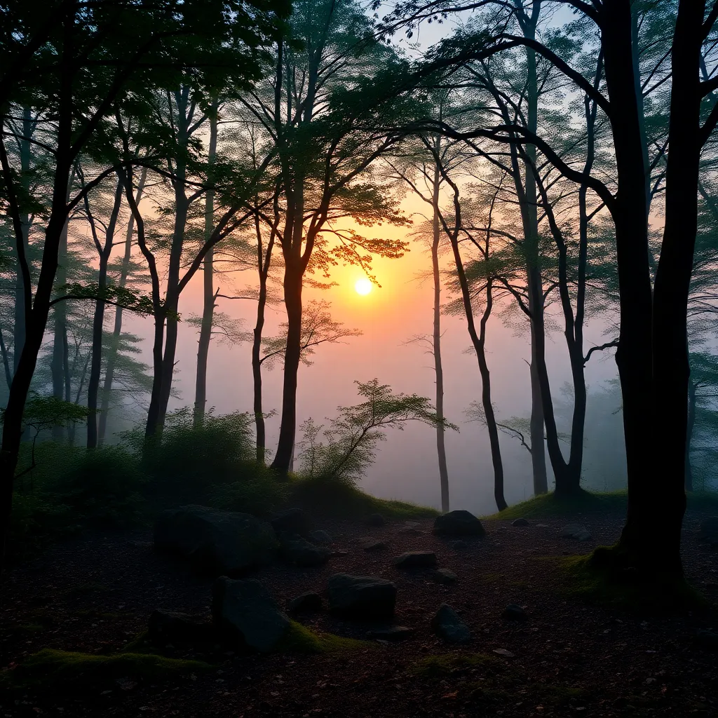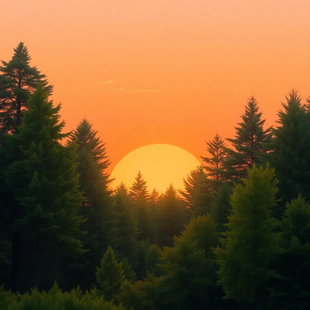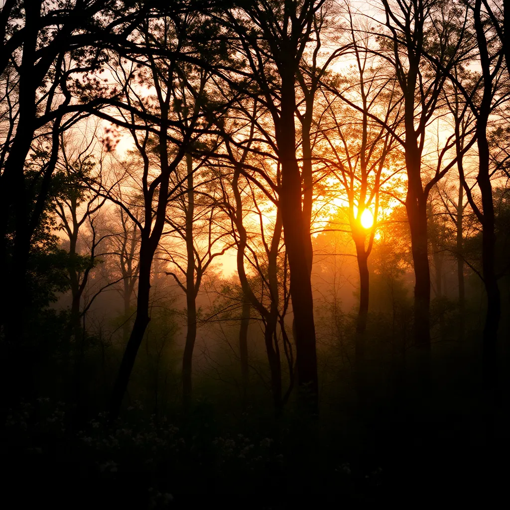 Imagine a mystical forest at sunset, with warm golden light filtering through the treetops. The air is filled with the sweet scent of blooming wildflowers. Create an image that captures this serene atmosphere, with a background color that changes from soft peach to rich terracotta as the sun dips lower.