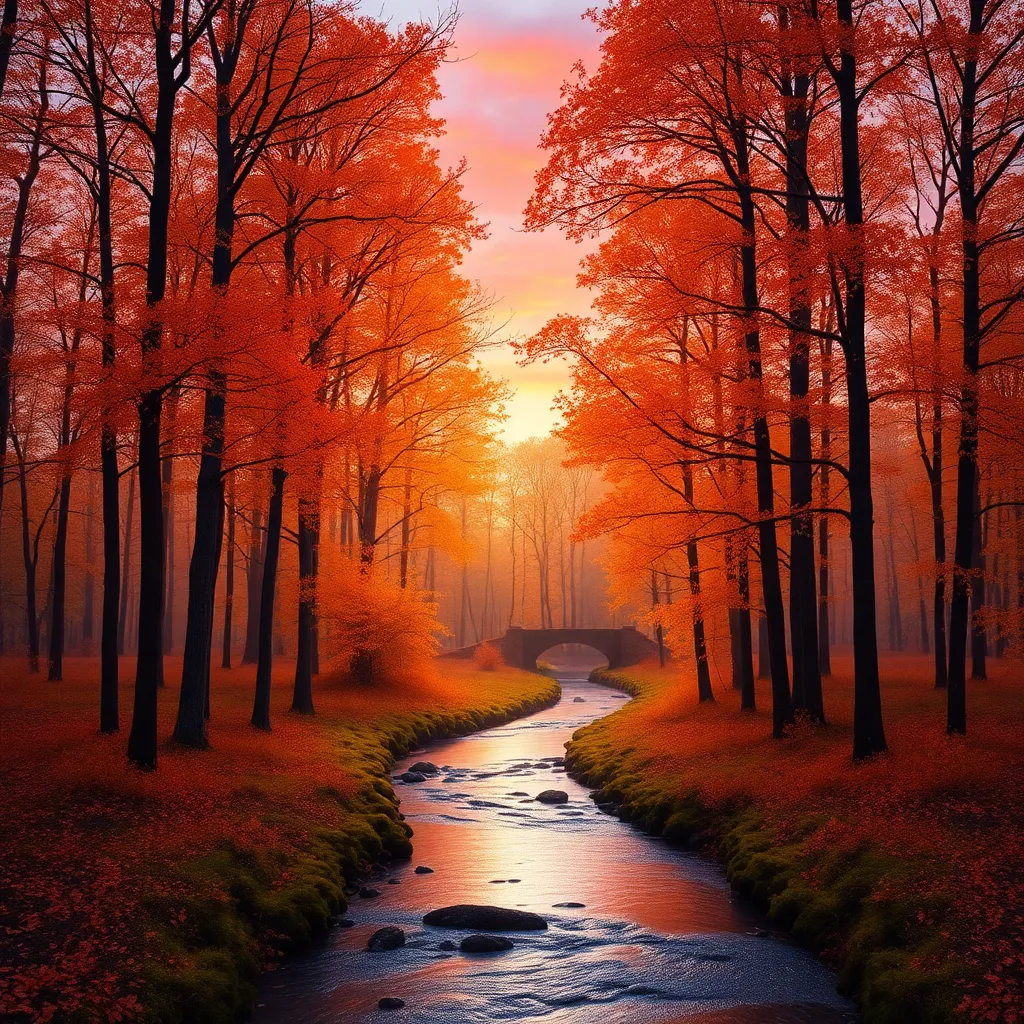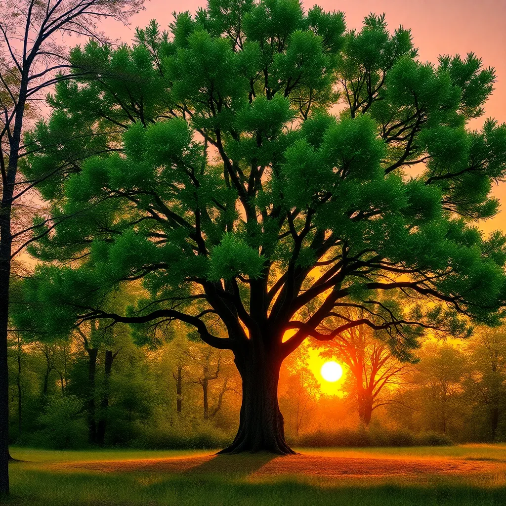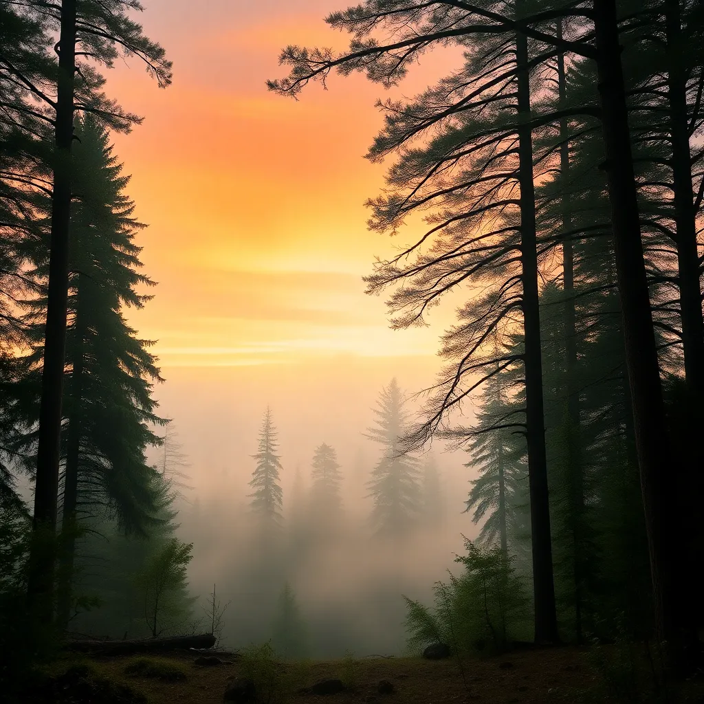 Imagine a mystical forest at sunset, with warm golden light filtering through the treetops. The air is filled with the sweet scent of blooming wildflowers. Create an image that captures this serene atmosphere, with a background color that changes from soft peach to rich terracotta as the sun dips lower.