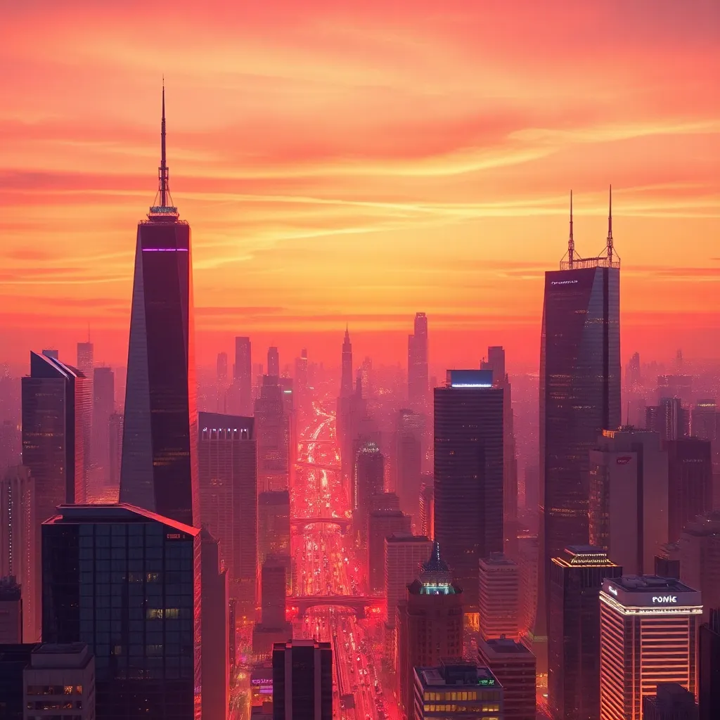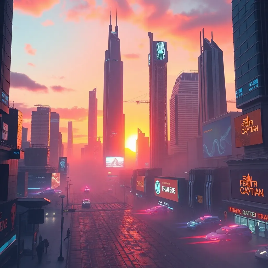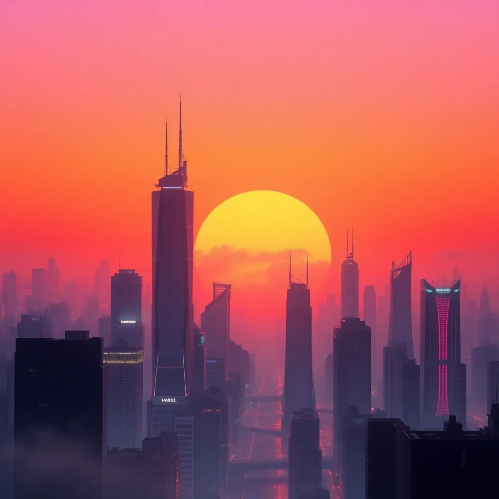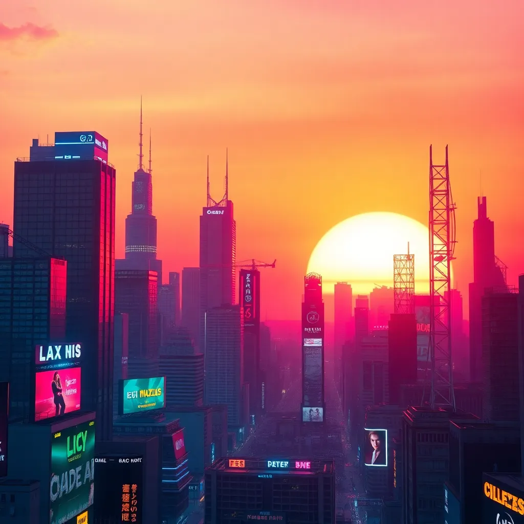 Create a futuristic cityscape at sunset. The city's towering skyscrapers and neon-lit billboards are set against a warm orange-pink background. The atmosphere is vibrant and energetic, with a sense of excitement and possibility. Use a mix of bright and muted colors to create a dynamic and visually striking image.