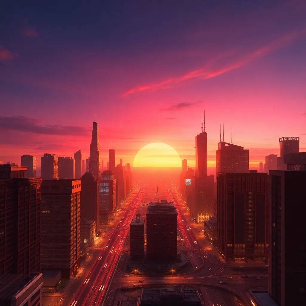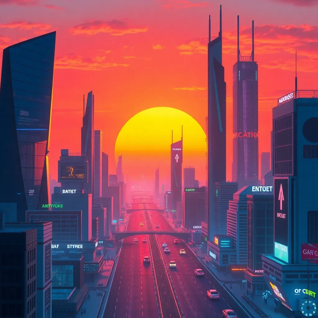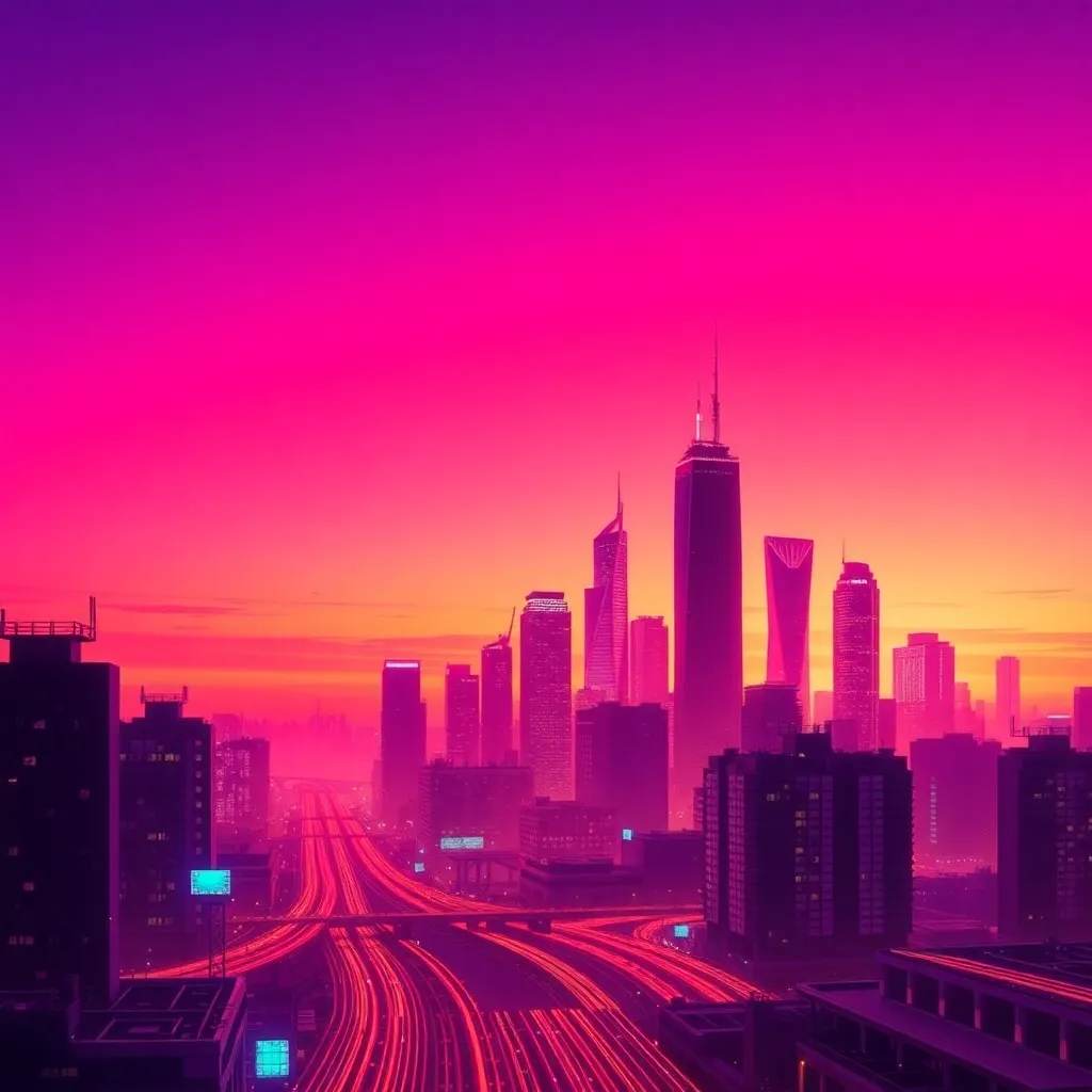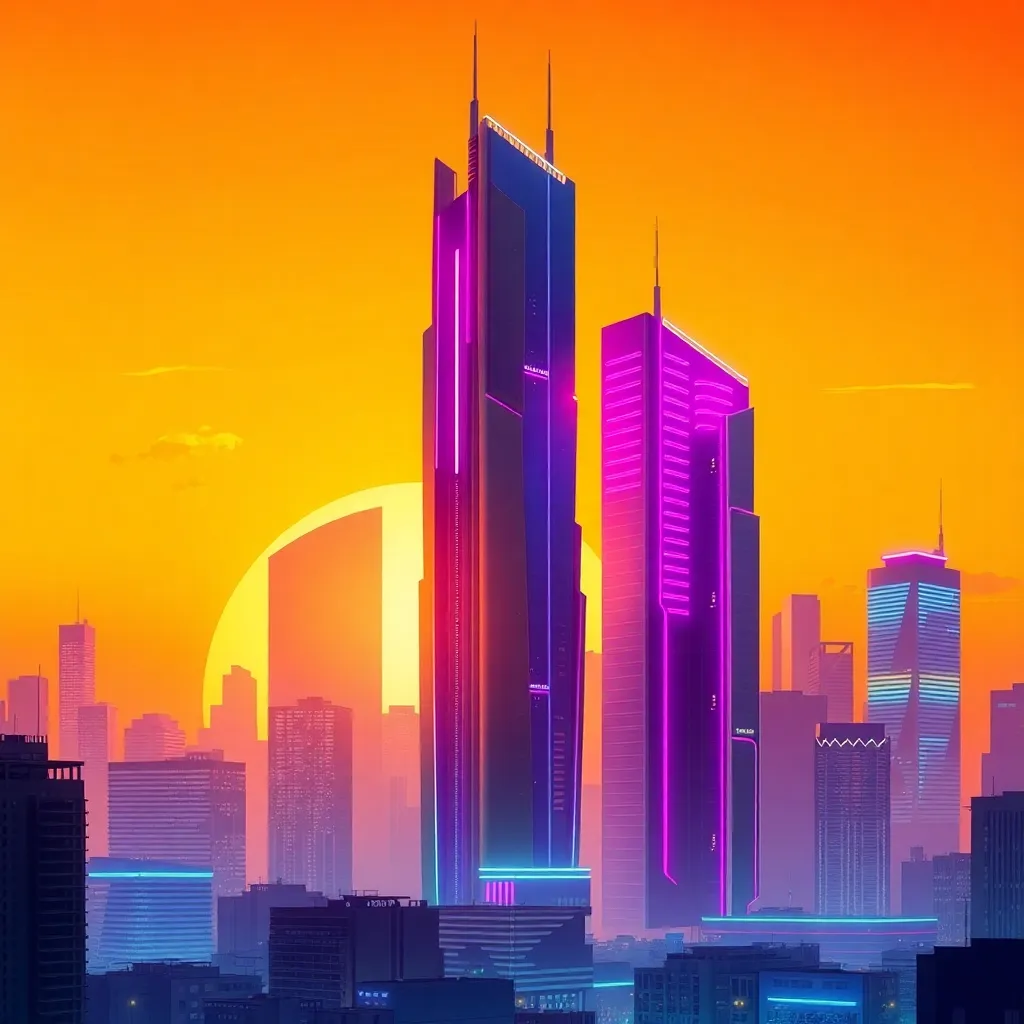 Create a futuristic cityscape at sunset. The city's towering skyscrapers and neon-lit billboards are set against a warm orange-pink background. The atmosphere is vibrant and energetic, with a sense of excitement and possibility. Use a mix of bright and muted colors to create a dynamic and visually striking image.
