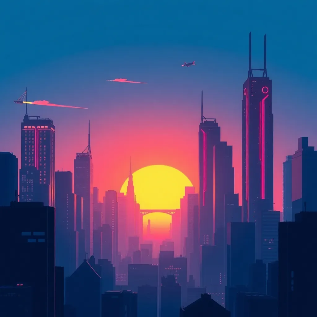Create a futuristic cityscape at sunset, with a warm orange and pink hue as the dominant background color. Incorporate sleek skyscrapers, flying cars, and neon lights. The atmosphere should be vibrant and energetic, with a sense of excitement and possibility. Use a mix of warm and cool colors to add depth.